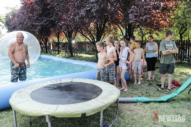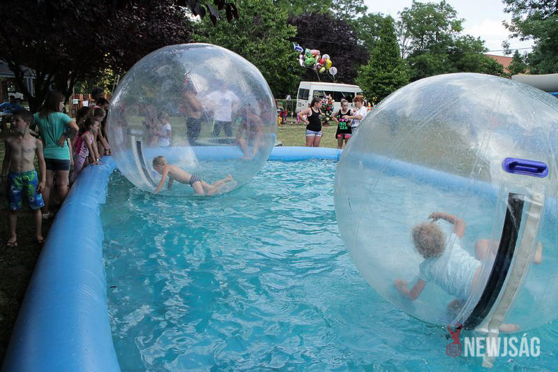 Néhány méterrel odébb óriás légvár és vízen guruló, felfújható labdák kötötték le a gyerekek figyelmét. Az utóbbinál folyamatosan kisebb sor kígyózott, mint kiderült elsősorban azért, mert a néhány perces pancsolás után a lurkók legtöbbször ismét a sor végére lopakodtak.