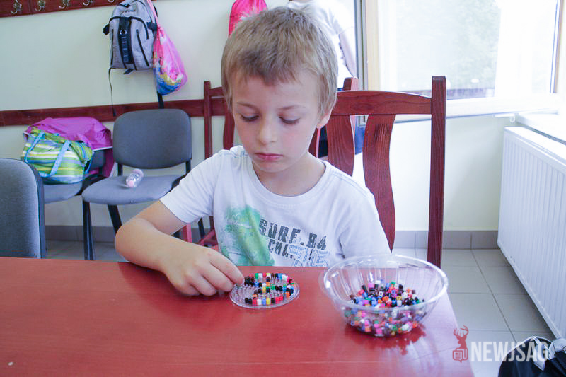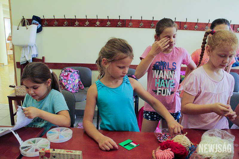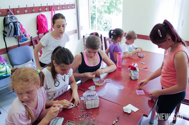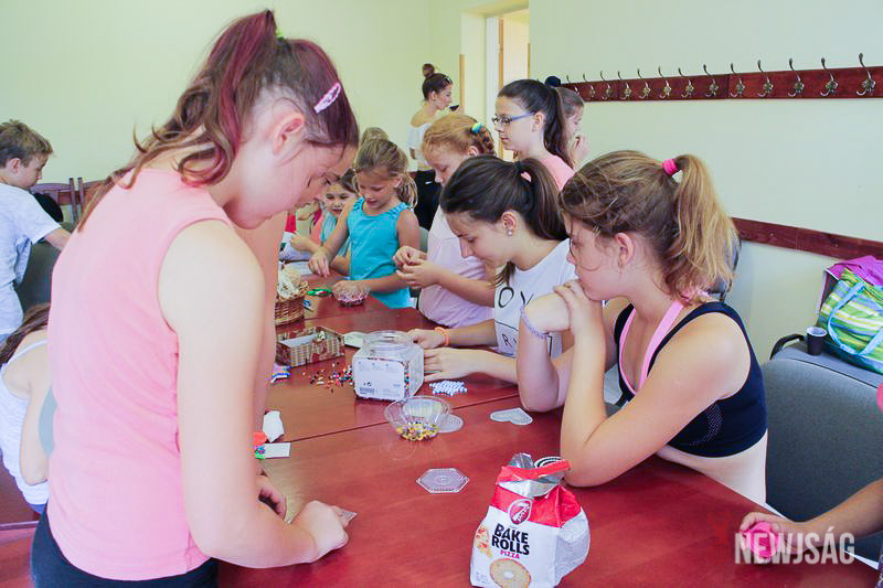Szerda délelőtt is ez a kettősség volt érzékelhető. Míg a csoport egyik fele a Margócsy-terem falai között ismerkedett a fitball sokszínű felhasználási formáival, addig a szomszédos helyiségben a kézműveskedésé volt a főszerep. A táborozók gyöngyöt fűztek és színeztek, hogy délután újult erővel vessék bele a Békésszentandrásra induló biciklitúrába.