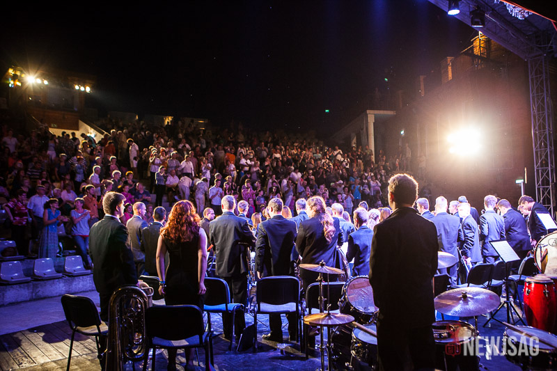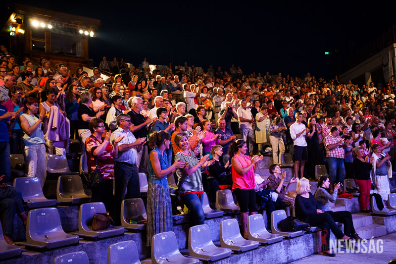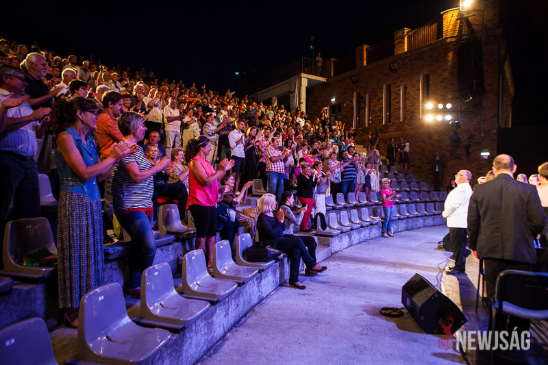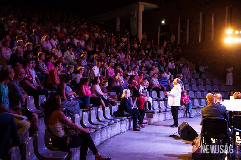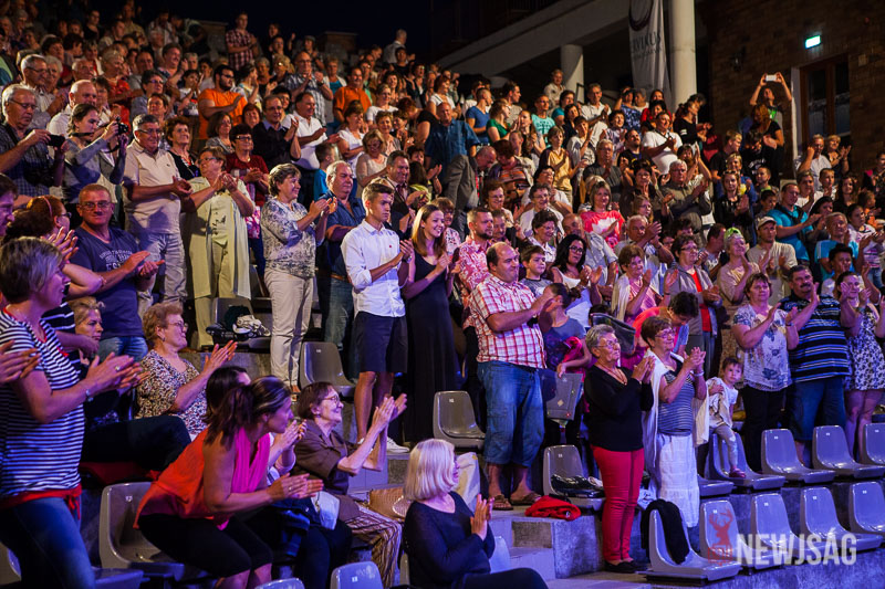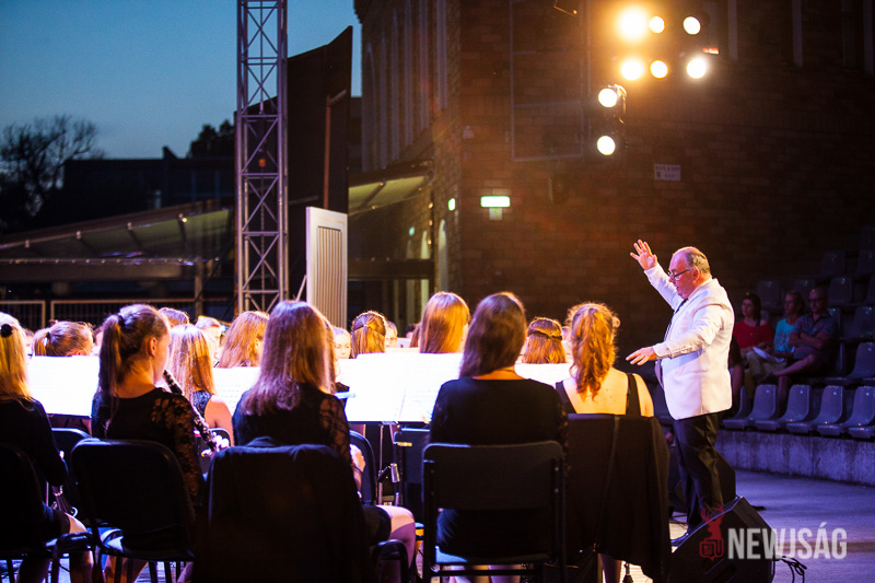 Magas színvonalú együttes koncertjét hallhattuk csütörtökön este a Vízi Színház színpadán. A fiatalok elegánsan jelentek meg, hangversenynek megfelelően – a lányok fekete ruhában, a fiúk fekete öltönyben, fehér ing nyakkendővel, karmesterükön fehér zakó.