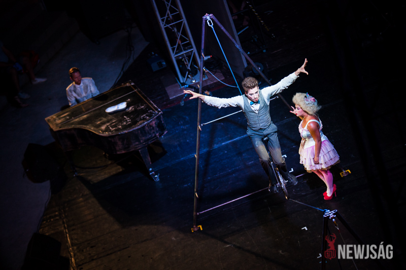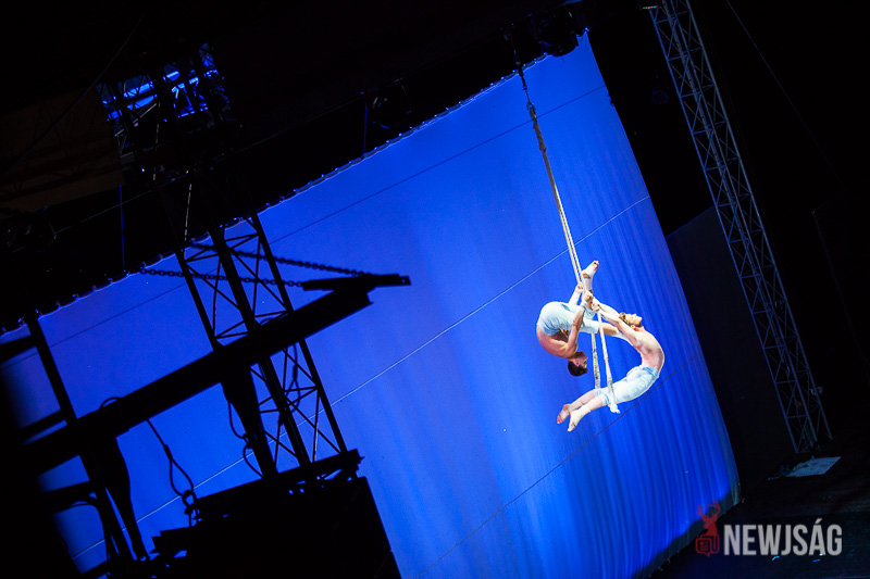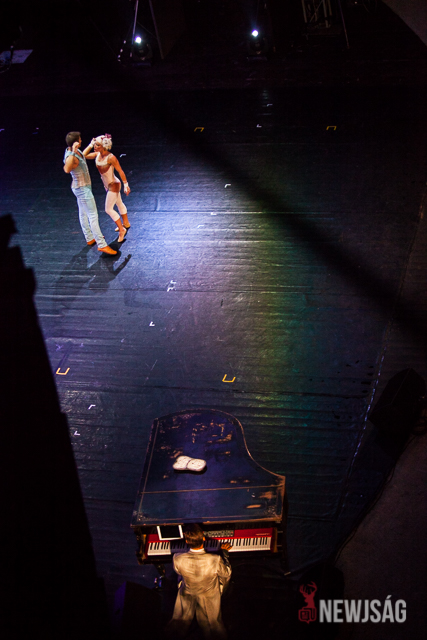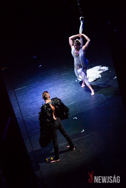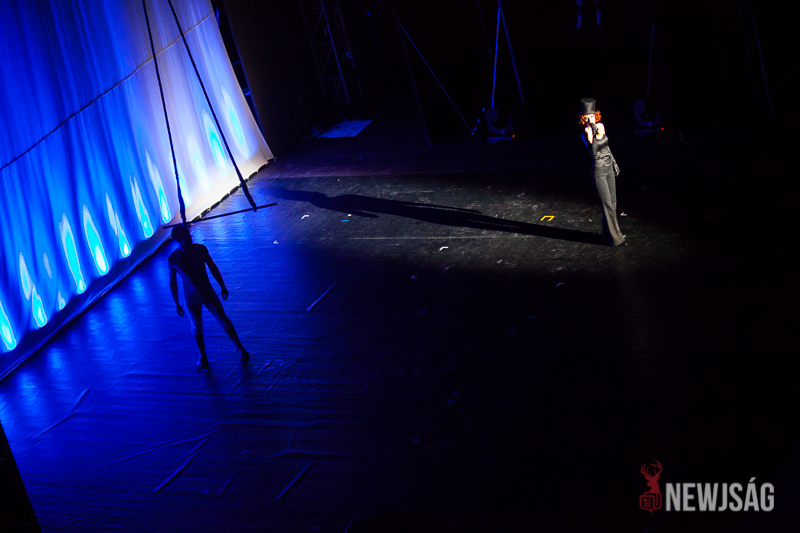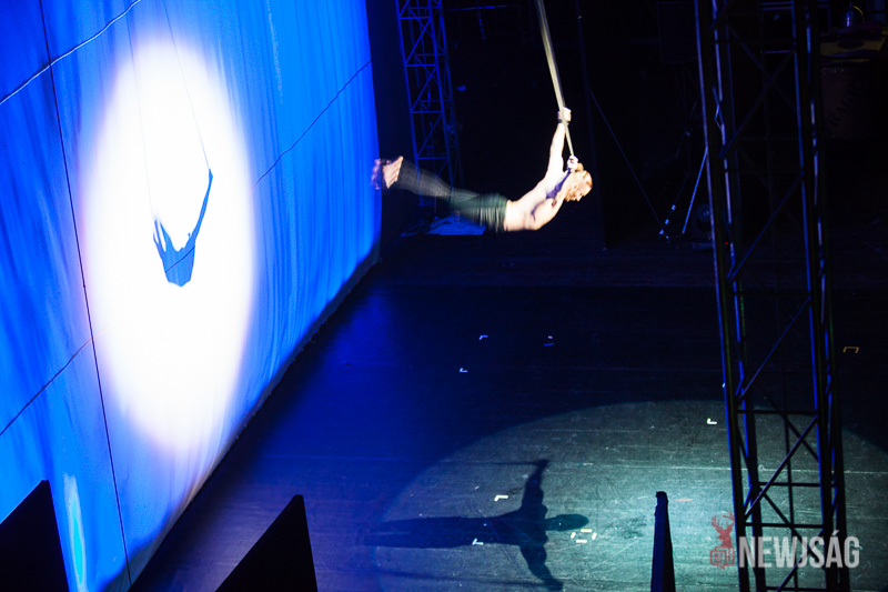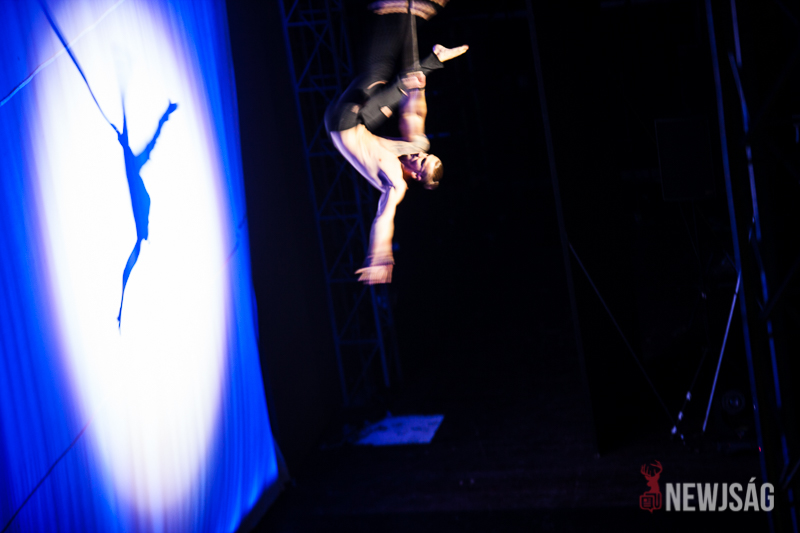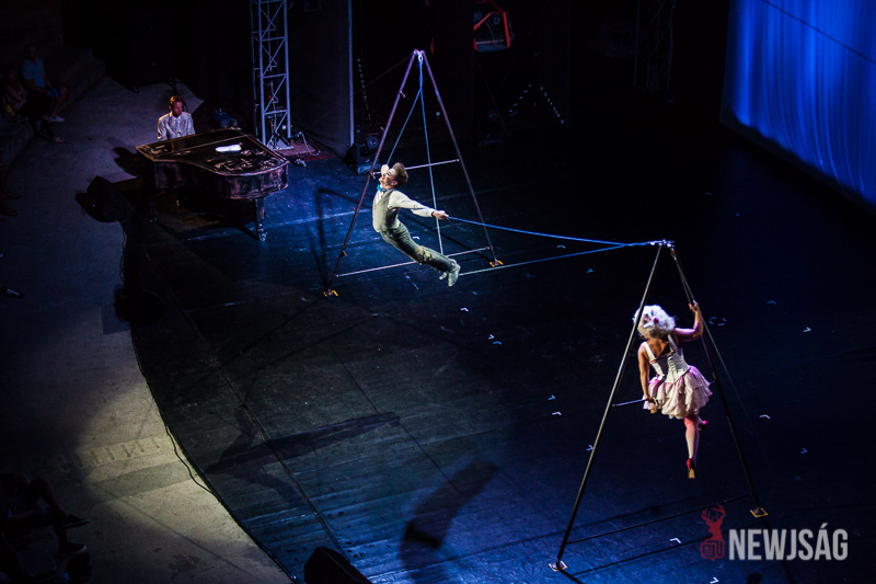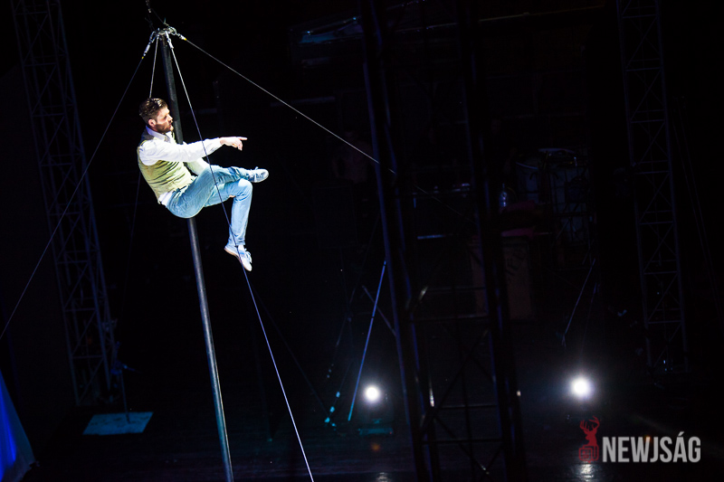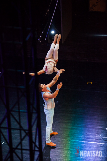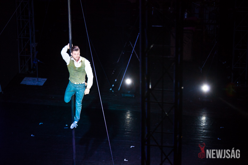 – A legutolsó darabunk a Non solus (nem csak) kétszemélyes nagyon komoly előadás. Gyakorlatilag a világon egyedülálló táncszínházi mű, amely a cirkusz és a tánc keveréke. Ketten játsszák, egy artistaművész, Illés Renató és egy táncművész, Zsíros Gábor (akik ma este is fellépnek a duó trapéz számban) –, Gábor táncos, de két éve neveljük őt artistává, teljesen átjárja a két műfaj.