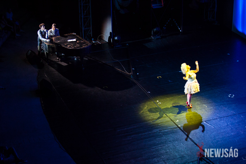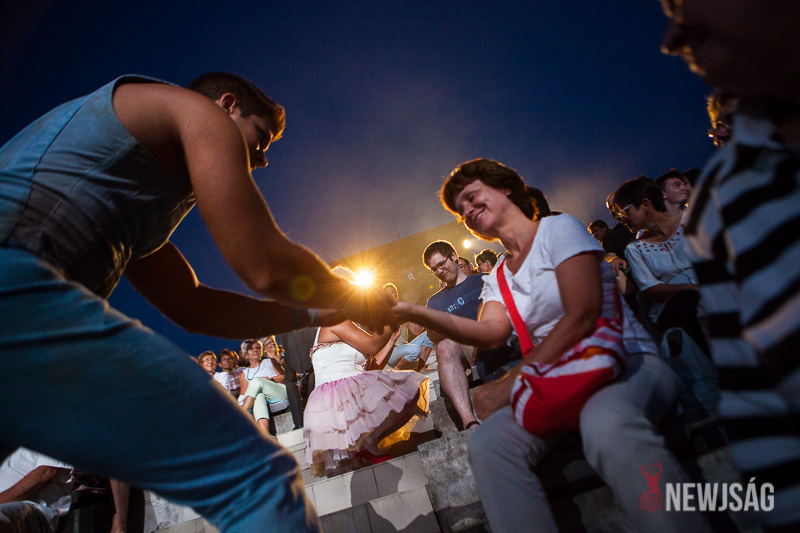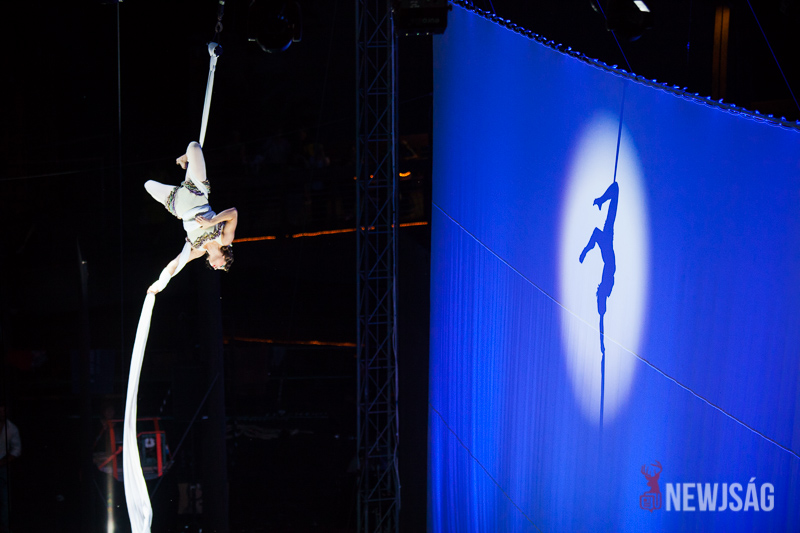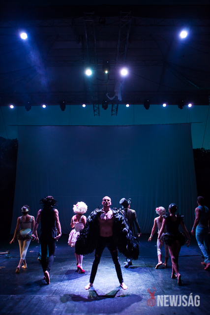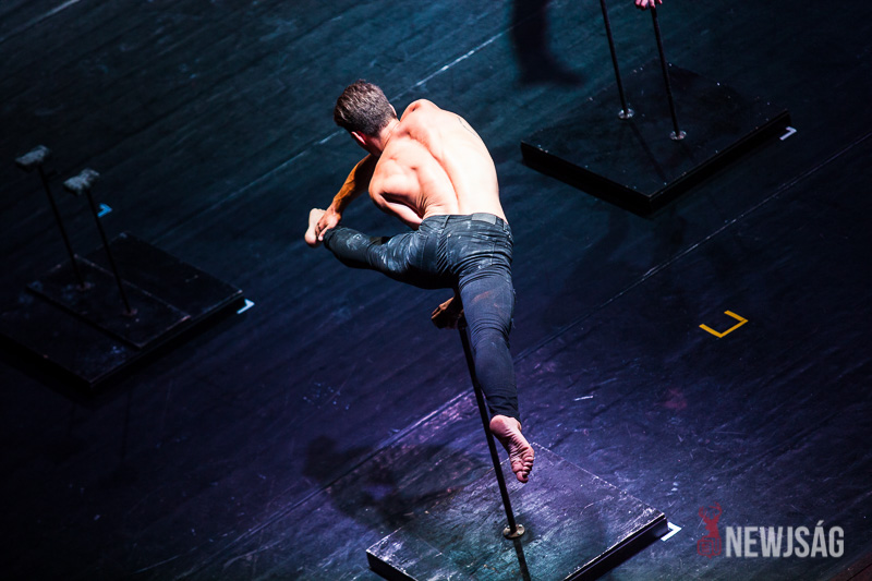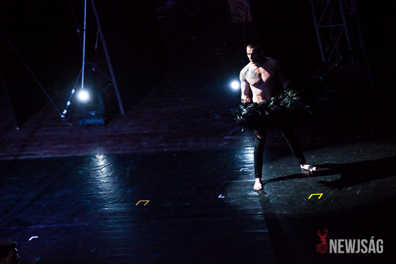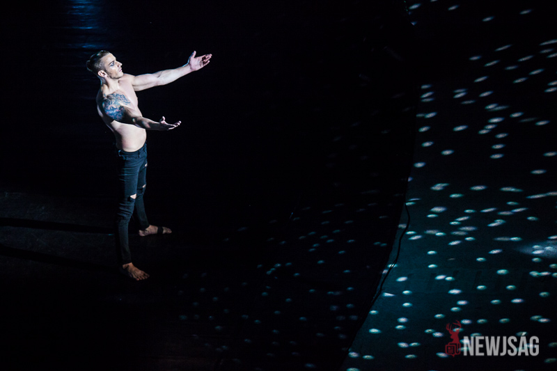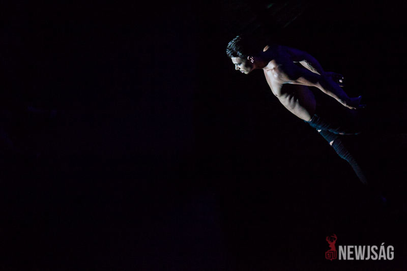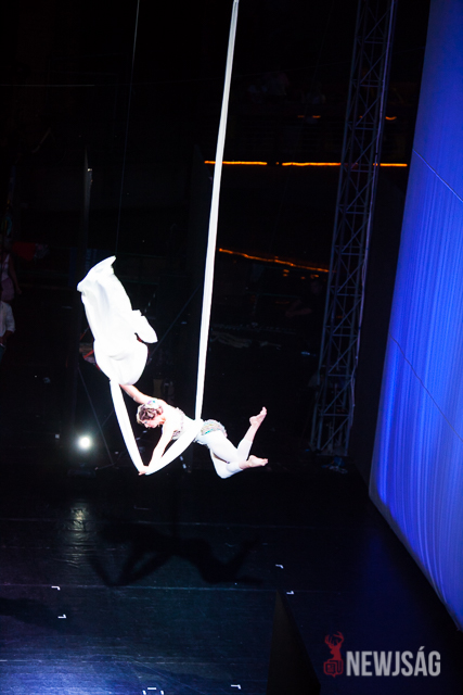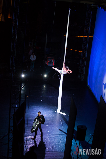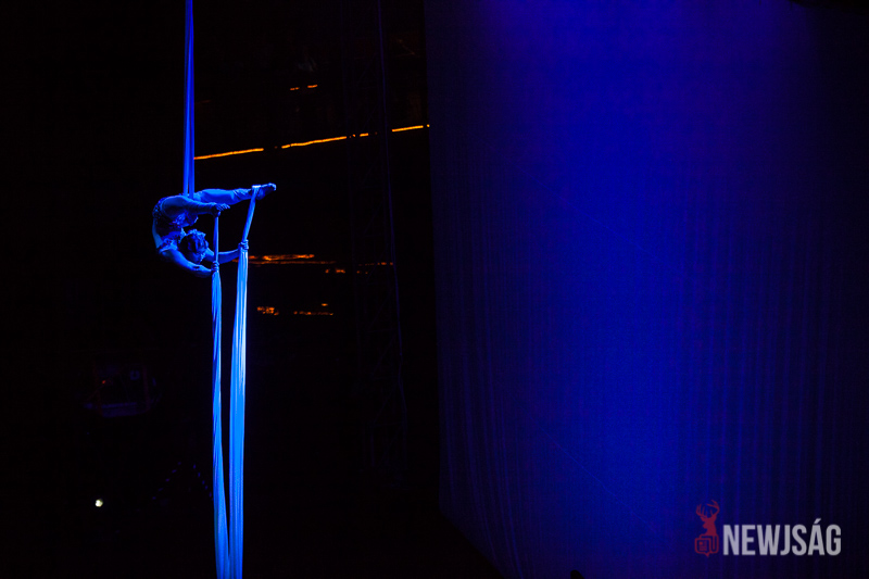– A legutolsó darabunk a Non solus (nem csak) kétszemélyes nagyon komoly előadás. Gyakorlatilag a világon egyedülálló táncszínházi mű, amely a cirkusz és a tánc keveréke. Ketten játsszák, egy artistaművész, Illés Renató és egy táncművész, Zsíros Gábor (akik ma este is fellépnek a duó trapéz számban) –, Gábor táncos, de két éve neveljük őt artistává, teljesen átjárja a két műfaj.