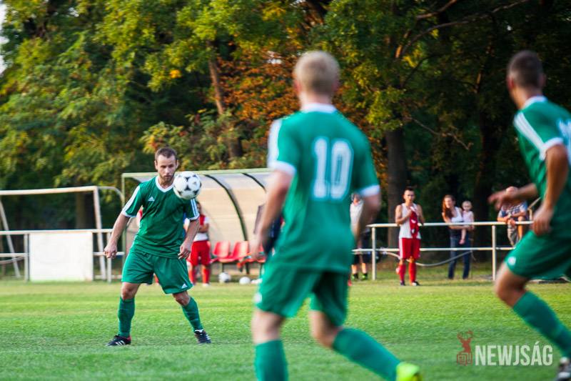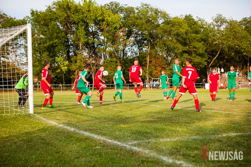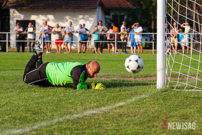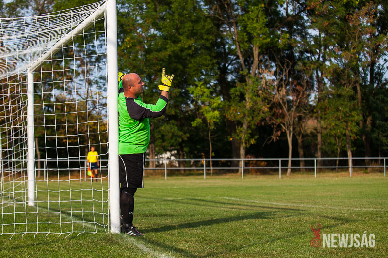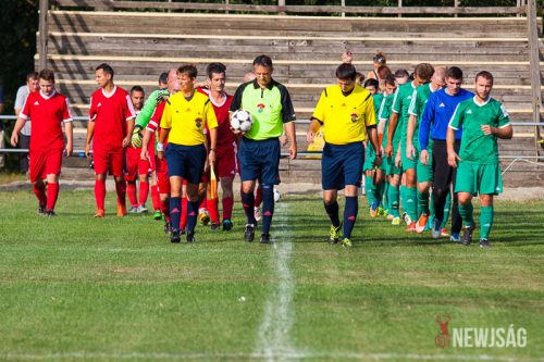 Aztán a 40. percben olyan gyakorlatot láttunk, aminek egyelőre keressük a nevét, de a mutatvány leginkább egy sorversenyre hasonlított. Büntetőhöz jutottak a vendégek olyan jó 20-25 méterről. Hatan álltak a labda mögé, jobbról és balról is hárman-hárman. A bíró sípjelére a két oldalról felváltva nekifutottak és átlépték a labdát, majd az utolsó játékos egyből kapura lőtte. A látványos előadás megzavarta a hazaiakat. A lövés a felső kapufáról levágódott, amit Lánczi Sándor fejelt a kapuba a dermedt védők között.