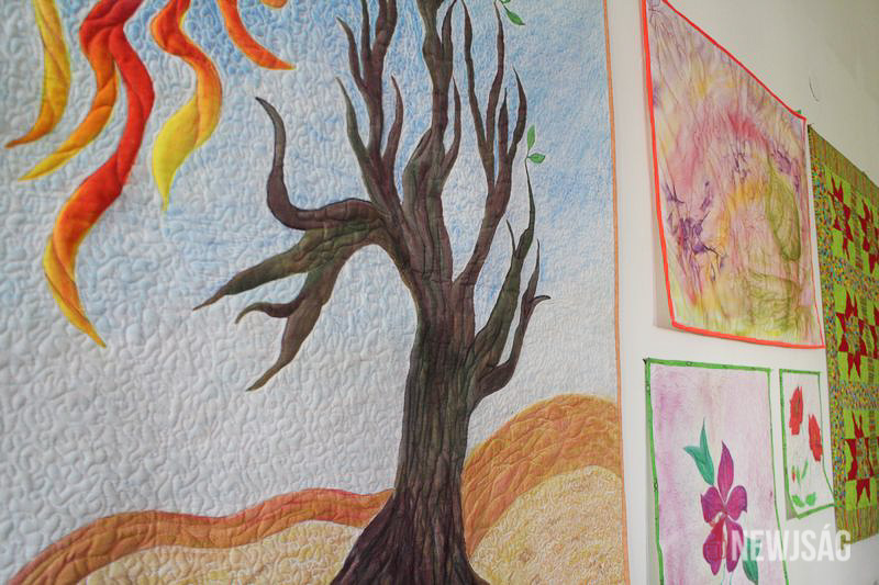 – Vannak különböző technikák a textilfestésen belül. Nagyanyáink pl. fazékba főzték, de akad ecsettel festett terítő, és folpack technikával készített falikép is. Valamikor gyakran használták a falihengert a lakásokban, amit én textilre alkalmaztam, és egy speciális anyaggal, a tyvekkel is kísérleteztem. Ezt leginkább az építőipar használja, de mivel varrható, mosható, nagyon jó alapanyagként szolgál a modern art képekhez. Mindazonáltal továbbra is foglalkozom a hagyományos technikával, és nagy szerelemként megmaradtak a táskák – mutatja be a falon sorakozó alkotásait.