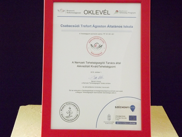 Iskolánk igazgatója 2016. október 1-jén, szombaton Budapestre utazott a Tehetségpontok találkozójára, a MATEHETSZ ünnepélyes táblaátadó rendezvényére. A Budai Ciszterci Szent Imre Gimnáziumban megtartott programon került átadásra az oklevél, mely szerint a Csabacsűdi Trefort Ágoston Általános Iskola Akkreditált Kiváló Tehetségpont lett. Az elismerést a Tehetséghálózat Minőségbiztosítását koordináló szervezet, a Magyar Tehetségsegítő Szervezetek Szövetsége adta ki, mely akkreditációs minősítés három évre szól.
