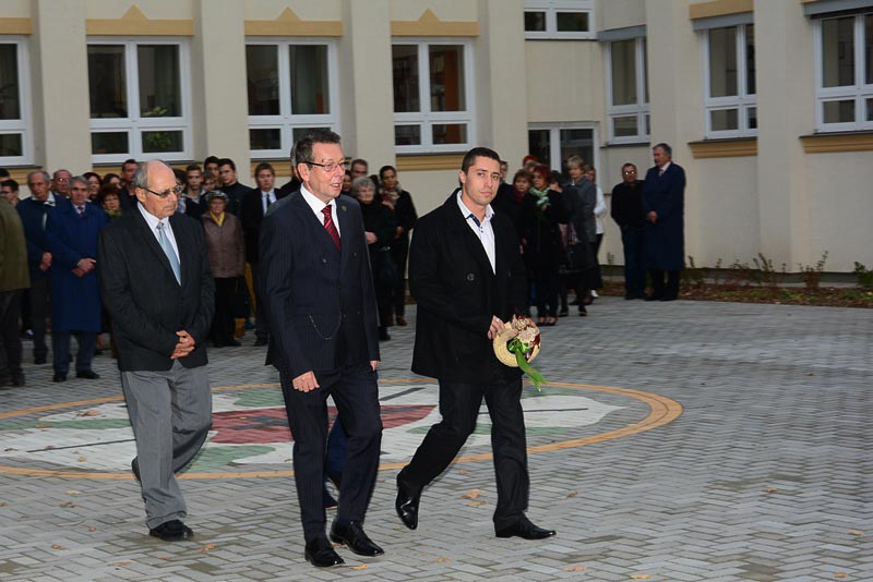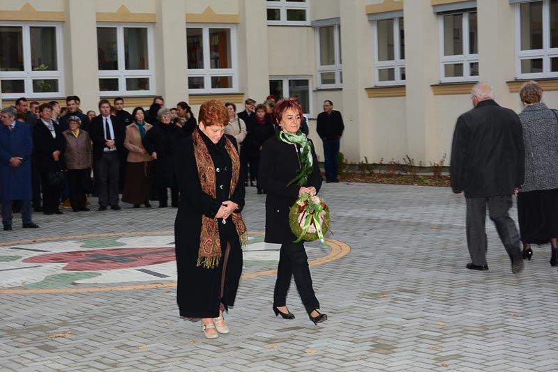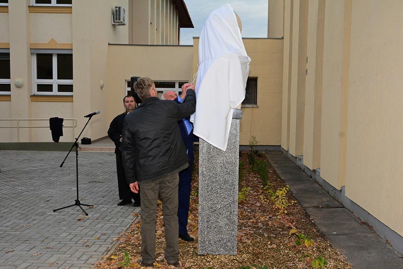 Az utolsó nehézségeket öregdiák társunk, Bődi János hárította el, aki Minya Gábor kőfaragó segítségével biztosította a felállításhoz nélkülözhetetlen költséges talapzatot, melyet ezúton is megköszönünk.