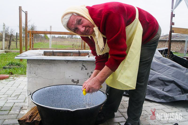 – Először sóval, majd citromsavval mostam át a beleket. Aztán raktam rá szódaport és ecetet, amitől elkezdett pezsegni. Fontos, hogy mikor húzgáljuk ki a belet, tiszta legyen, ne maradjon rajta háj. Legalább húsz lében át szoktam mosni, mert ha a böllér egy kis szagot is megérez rajta, visszadobja. Utána szoktuk „sjamuválni”, ahogyan mifelénk mondják, vagyis húrolni, a vastag beleket pedig „spendluváljuk”, vagyis hurkapálcikával megkötözzük – magyarázza a mindenkori feladatát Medvegy Györgyné Jutka néni.
