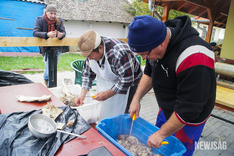 A kis csapat mindent hagyományos módon készített: pörzsölte és darabolta a disznót, kézzel mosta a beleket, abalevet főzött, közben pedig lelkiismeretesen emelgette a feles poharakat. Egyedül a korai kezdésből engedtek egy keveset. Pirkadat helyett csak a délelőtti órákban veselkedtek neki a munkának, amiből a klubtagság zöme kivette a részét.