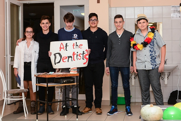 Ha nyelvi hét és kedd, akkor Halloween! Az egyetlen fix programunk helyszínéül ezúttal is menzánk szolgált, idén már harmadik alkalommal, rutinosan rendeztük be a termet, ahol a 9.B-sek rövid jelenete után hat csapat vetélkedett egymással kilenc hagyományos, visszatérő vagy új feladat során. Ami viszont állandó volt az este során, az a nevetés. A gyakran maszkok mögé rejtőző csapattagok jókedvűen építettek egymás homlokára keksztornyot, tesztelték orrukat és fordítási képességeiket, ügyeskedtek teniszlabdákkal vagy éppen próbáltak meg zöldségeket és gyümölcsöket a fogaikkal vízből kihalászni. A vetélkedő végére még a szemerkélő eső is elállt, így semmi nem akadályozhatta meg a versenyzőket abban, hogy idén is előkapják modern zseblámpáikat, és telefonjaik segítségével próbálják meg az udvaron levadászni az előre elrejtett 90 papírtököt. Sikerüket jól mutatja, hogy végül 85-öt be is gyűjtöttek, ezzel is gyarapítva pontjaik számát. Végül a Fatal lullaby nevű csapat gyűjtötte a legtöbbet, így a 2016-os Halloween Party az ő sikerükkel zárult.