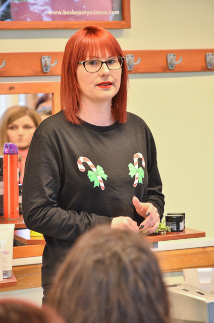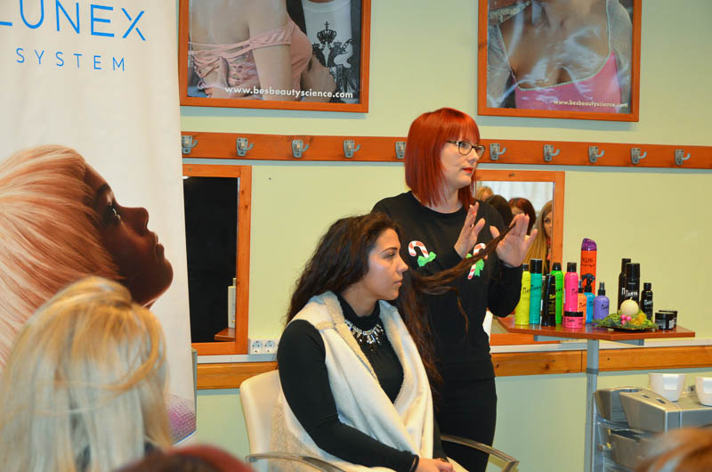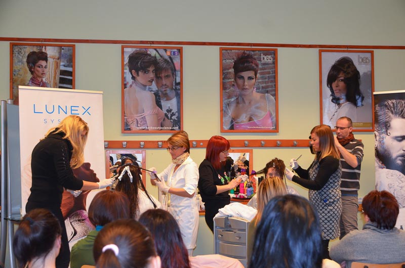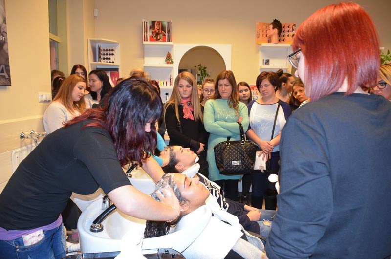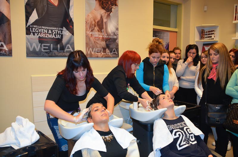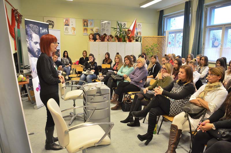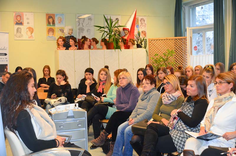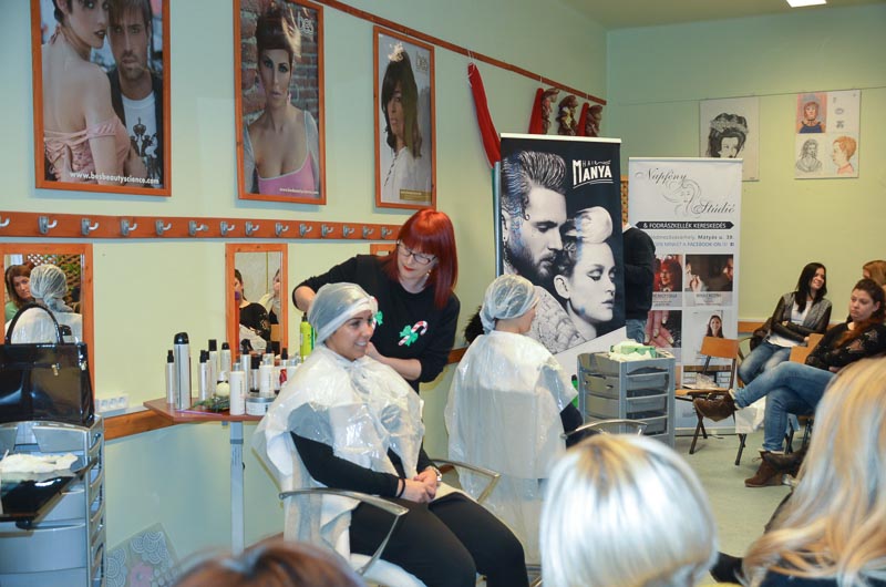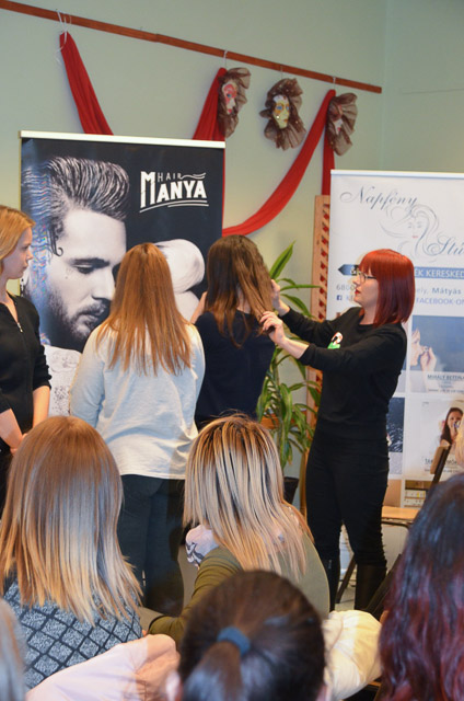 A szakmai bemutatót Martonné Nagy Csilla tartotta, aki a Kemon professzionális fodrászmárka oktató- és bemutatófodrásza. A tapasztalt előadó két modell segítségével ismertette a Kemon UNAMY SETA keratin hajápoló- és hajfeltöltő rendszert lépésről lépésre. A tanulók megfigyelhették a haj állagának, fényezettségének lényeges változását, amit az eljárás alkalmazása eredményezett. Sőt, maguk is részt vehettek a hajfeltöltés folyamatában. Az oktatófodrász részletesen bemutatta a HAIR MANYA professzionális styling termékcsaládot. Ezáltal a szépészetes diákok bővíthették az elméleti tudásukat is. Az anyagismeret mellett a hajszerkezetre vonatkozó anatómiai ismeretek is előtérbe kerültek.