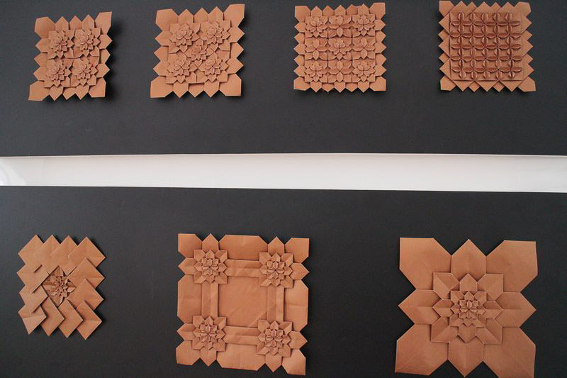 A kiállításból az is kiderül, hogy a legkülönbözőbb féle papírok szolgálhatnak alapanyagul: az újságpapírtól kezdve a művészi kartonokon át egészen az ún. szendvicspapírokig, amelyeknek a közepén fémfólia található. Mindezek mellett akár vörösrézlemezt, organzát vagy vásznat is lehet hajtogatni, igaz, egy sokkal több odafigyelést és időt igénylő technikával.