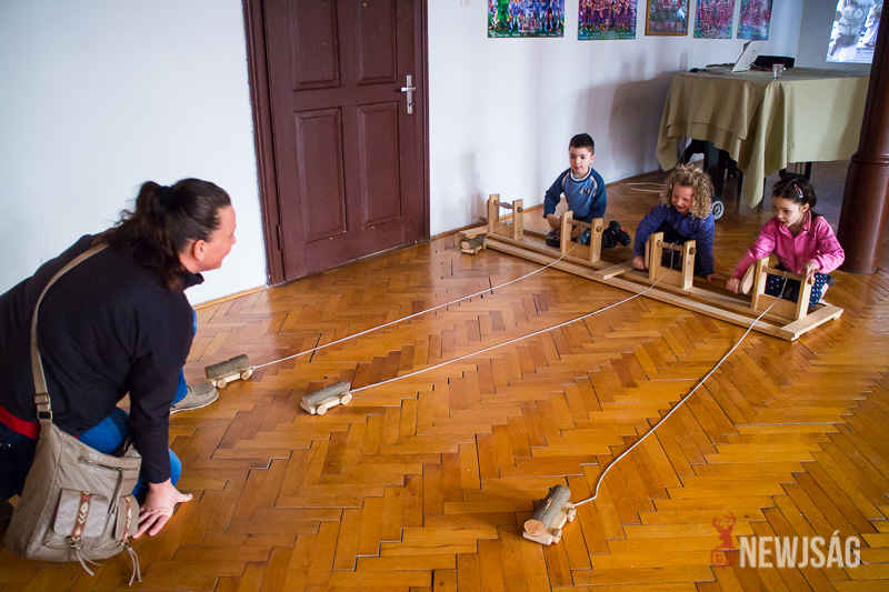 A nagyteremben a hagyományőrzés, kézműveskedés és a játék ötvöződött. Az egyik sarokban pl. a rönkhúzást idézték fel, egy játékos kocsihúzó verseny erejéig. A mellette elhelyezett tájékoztatóból az is kiderült, a szokást egykor jellemzően az Őrségben tartottak. Eszerint, ha vízkereszttől hamvazószerdáig nem volt esküvő a faluban, egy „vénleányt” adtak férjhez, az ifjú párt pedig egy „szégyen-tönkre” ültetve húzta végig a falun a násznép.