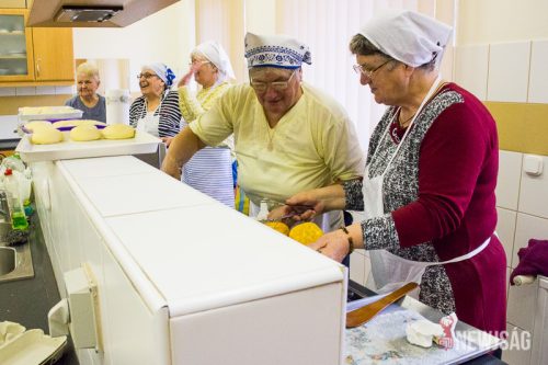 – A legfontosabb, hogy jól kidolgozzuk a tésztát – mutat rá Csicsári Lajosné Ica néni azonnal a habkönnyű fánk egyik ismérvére. – Itt azonban egytől-egyik gyakorlott háziasszonyok vesznek körbe, akik már érzik, hogy mikor jó, és szinte egymás kezéből veszik ki a munkát.