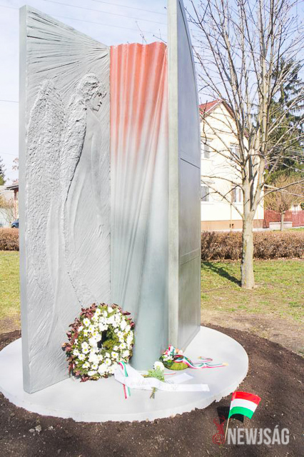 – Ez az emlékmű szimbolikusan az ’56-os forradalomnak azt a mozzanatát ábrázolja, amikor a magyarság egy nagyhatalmi vasfüggönytől szabadulni próbál – segít a mű értelmezésében az alkotó. Ezt jelképezi az ajtót lebbentő függöny, ami a magyar zászló is egyben, és képzeletben egészen november 4-ig viszi el a szemlélődőt. Mint tudjuk, ezt követte a megtorlás időszaka, a szabadságvágy pedig egészen a rendszerváltásig ott dolgozott az emberekben. Mégis azt gondolom, ennek a néhány hétnek köszönhetően lehet most nekünk emlékművünk.