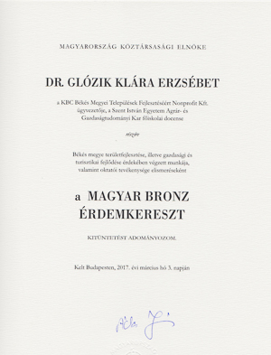 A nemzeti ünnep alkalmából Áder János köztársasági elnök a Magyar Bronz Érdemkereszt polgári tagozata kitüntetést adományozta dr. Glózik Klárának, a KBC Békés Megyei Települések Fejlesztéséért Nonprofit Kft. ügyvezetőjének. A turizmusban ismert szakember mindemellett a Szent István Egyetem Agrár- és Gazdaságtudományi Kar főiskolai docenseként is tevékenykedik. A kitüntetést Békés megye területfejlesztése, illetve gazdasági és turisztikai fejlődése érdekében végzett munkája, valamint oktatói tevékenysége elismeréseként érdemelte ki.