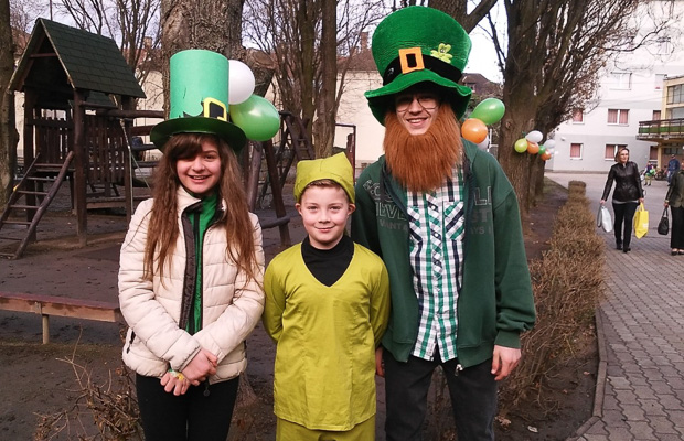Szent Patrik napja alkalmából idén másodszor öltöztek zöld, fehér, narancsba, vagyis az ír nemzeti színekbe diákjaink, pedagógusaink és iskolánk. Előkerültek a ritkábban használt zöld nadrágok, pólók, szoknyák, cipők, kiegészítők, sőt jobb híján hálóingek, hogy mindenki öltözékével is kifejezhesse, egy közösség tagjai vagyunk és ma az írek védőszentjére, Patrikra, az ír kultúrára fókuszálunk. A környező üzletekből elfogytak a zöld papírok és a zöld ételfesték is hiánycikké vált, hiszen iskolánk megtelt az ír jelképekkel, a zöld és szivárványszín különböző árnyalataival.