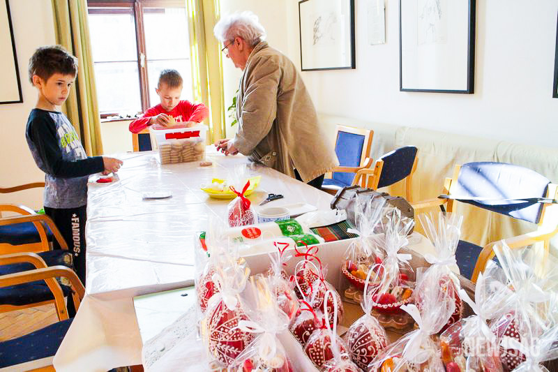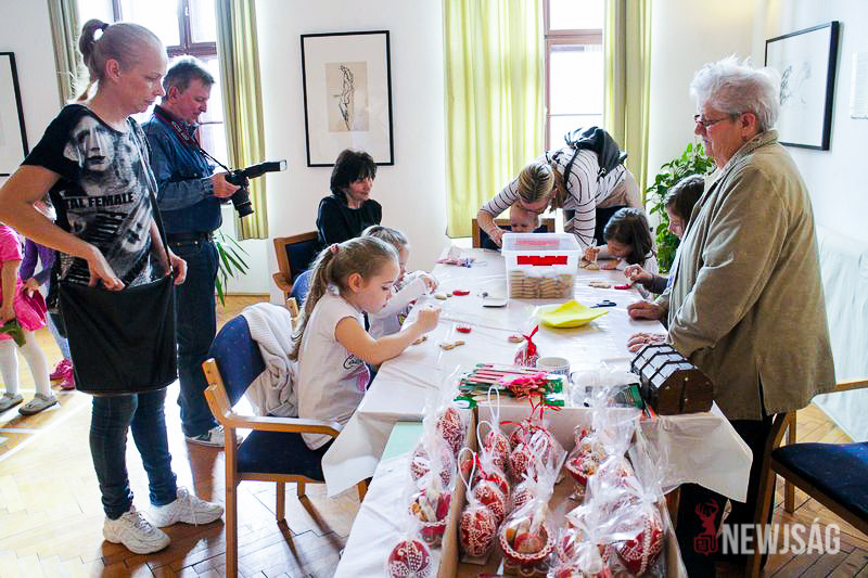 A bejárat melletti részre ezúttal is népies motívumokkal díszített tojások hívták fel a figyelmet, alapanyaguk azonban eltért a hagyományostól. Uhljar Mátyásné, vagy ahogyan mindenki ismeri, „mézes Margó” idén balesetmentesebb oldaláról közelítette meg az ünnepkört, és mézeskalácsból készült csibével, nyuszival, báránnyal és piros tojással várta az alkotni vágyó gyerkőcöket.