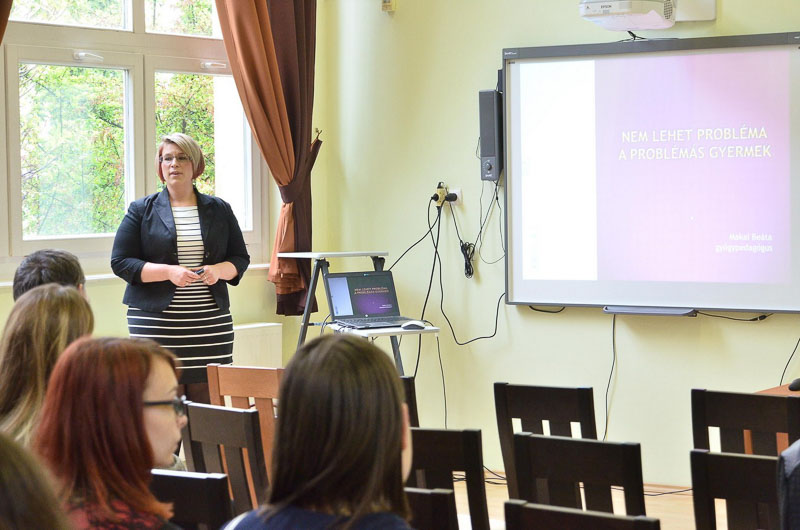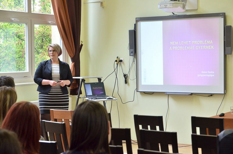 A következőkben Makai Beáta gyógypedagógus tette fel a kérdést: lehet-e probléma a problémás gyermek? Előadásában a különleges bánásmódot igénylő gyermekek oktatását-nevelését helyezte a középpontba. Mivel az érettségi követelményekben is szerepet kapnak a speciálpedagógiai ismeretek, tanulóink szakszerű felkészítést kapnak ebben a témakörben is.