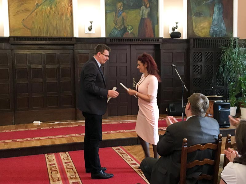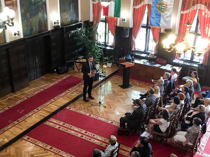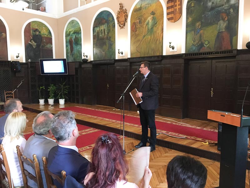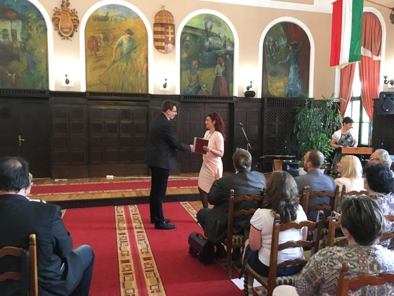 Bíró Gyula igazgató, főiskolai mestertanár a díj átvételekor köszönetet mondott az elhívásért, a POK megyei vezetőjének, az Oktatási Hivatal munkatársainak mind az intézmény, mind a fenntartó Gál Ferenc Főiskola, mind a Szeged-Csanádi Egyházmegye és Dr. Kiss-Rigó László megyéspüspök, nagykancellár nevében. A fenntartó főiskola képviseletében jelen volt Dr. Kozma Gábor rektor, főiskolai tanár képviseletében Dr. Lipcsei Imre dékán, főiskolai tanár. Bíró Gyula elmondta, hogy intézményük a megtisztelő címet szolgálatnak tekintik, annak a szolgálatának, hogy minden erőfeszítésükkel segítsék a köznevelés ügyét, a reformfolyamatok hatékonyabbá tételét, és a kiváló szakmai paraméterek mellett a lelkiségre is megfelelő hangsúlyt fektetve szolgáljanak Békés megye állami, önkormányzati és egyházi fenntartású intézményeinek. A nevelés ügyének fontosságát kihangsúlyozva elmondta, hogy Békés megye egyetlen Gyakorlóintézményeként, köznevelési és felsőoktatási feladatok ellátójaként örömmel vállalja, hogy küldetésének megfelelően támogassa a szakmai innovációkat, a pedagógus szakma „frissülését”, a horizontális tudásmegosztást. Kiemelte, hogy ebben kiváló támogatója a fenntartó Gál Ferenc Főiskola, és az a történelmi múlt, amit a szarvasi pedagógusképzés jelent. Az adottságok kiválóak, hiszen remek szakvezetői kar mellett innovációs programok – tablet program, LEGO program, sportélet, korai idegen nyelvhez szoktatás program fejlesztése, stb. – szerepel a klasszikus módszertani kínálat mellett, amelyek átadhatóak, és átadandóak, ezzel lehetőséget biztosítva a kölcsönös tanulásnak, az egymástól és egymásért való tudásátadás-átvétel gyakorlati megvalósulásának. Az intézmény bemutatásában kitért Szarvas város csodálatos adottságaira, páratlan természeti értékeire, kulturális büszkeségeire. Gondolatait zárva elmondta, hogy a címre úgy tekintenek, mint feladatra, és öröm számukra, hogy a Gál Ferenc Főiskola a megye több városában is bizonyíthat, hiszen Szarvas város mellett Békés városában és Gyula városában is kitűnő fejlesztések, építkező programok mutatják a fenntartó és az egyházmegye társadalmi feladatvállalását, innovációs erejét és elkötelezettségét az értékek szolgálata mellett.