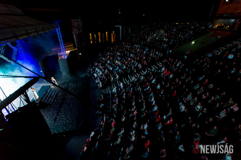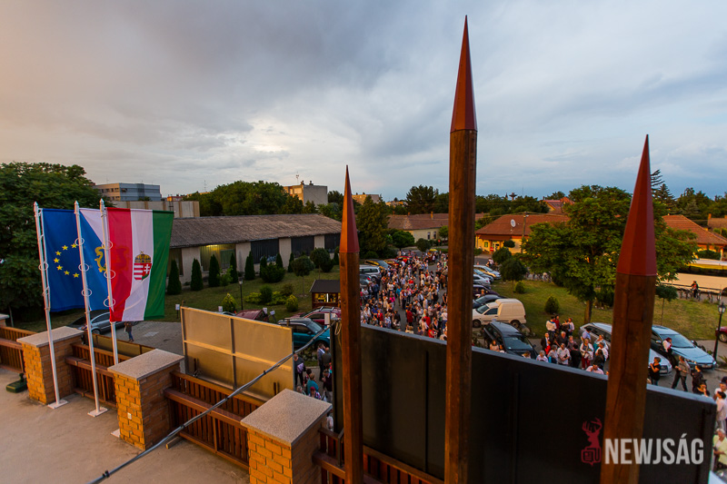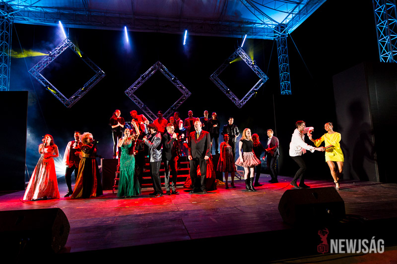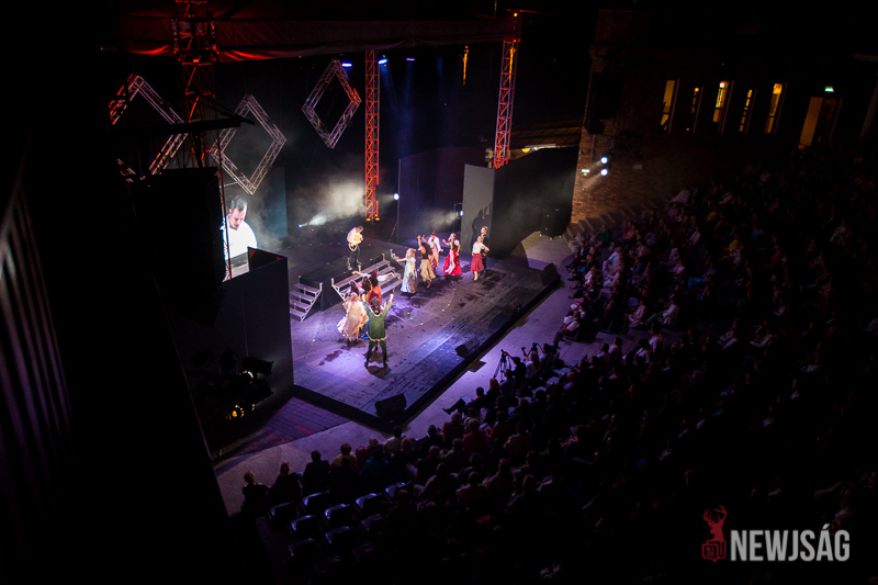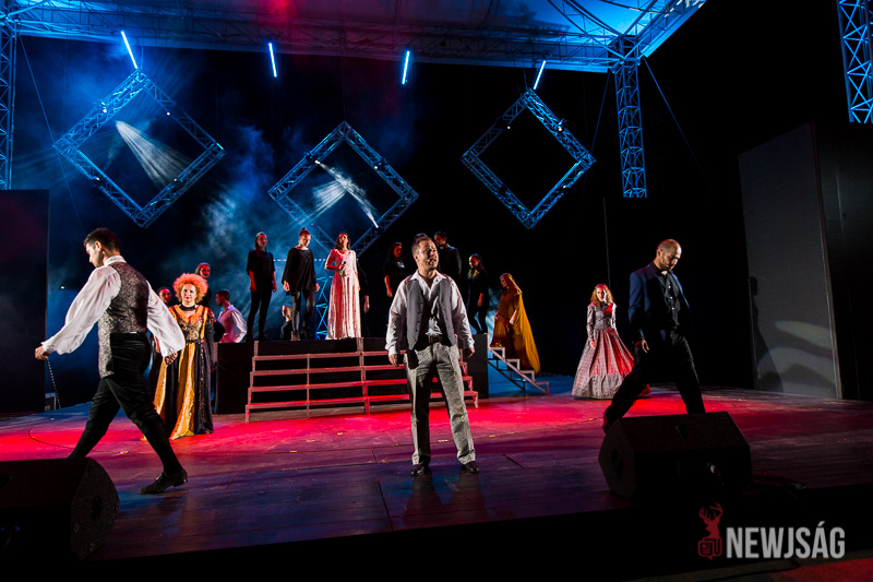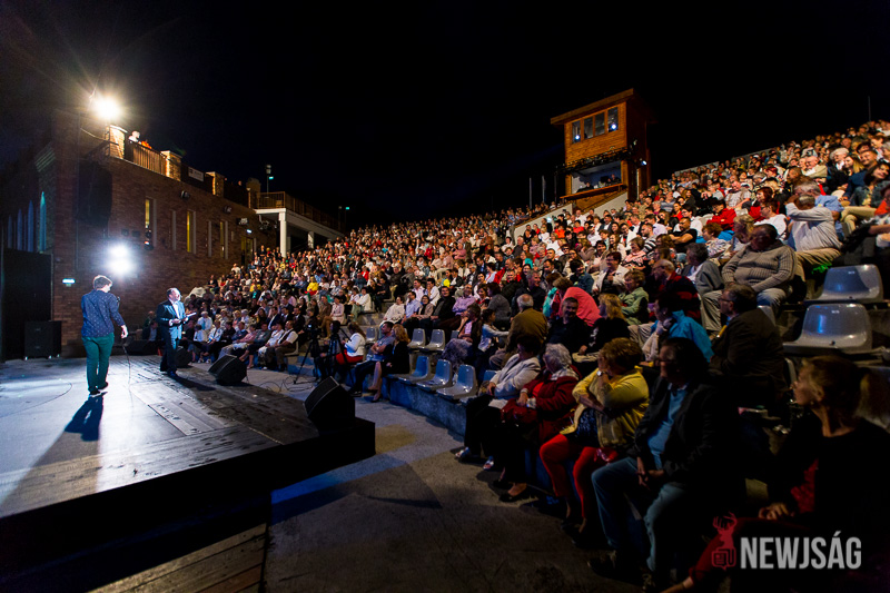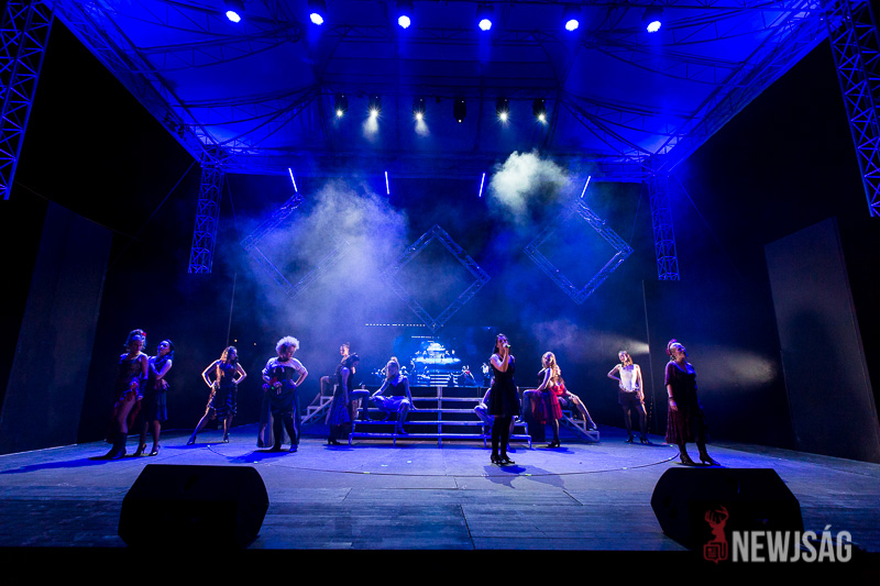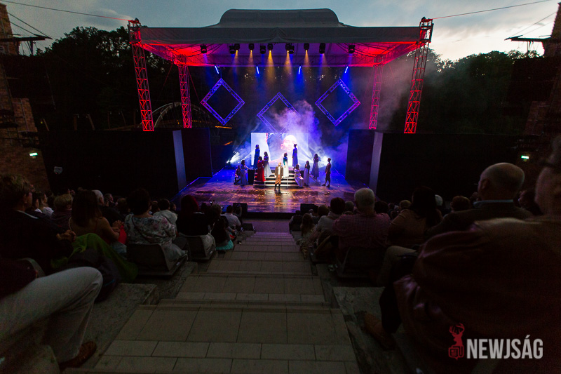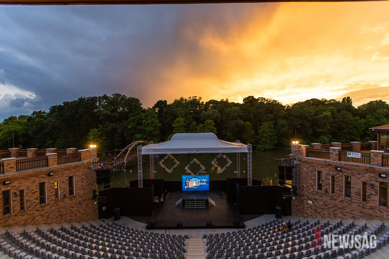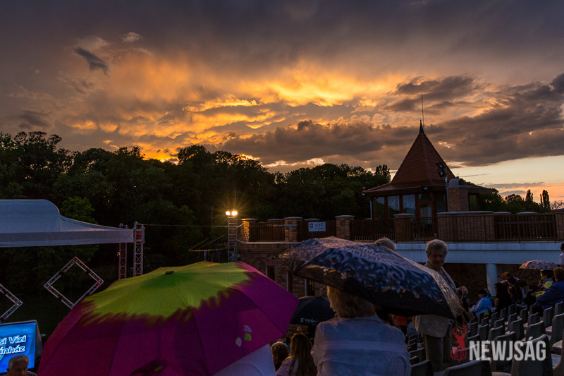 Már nagy tömeg várt a parkolóban a bebocsátásra, amikor egy nagyon rövid zápor kinyittatta az esernyőket, miközben a természet a másik oldalon csodálatos naplementével kért bocsánatot az iménti kis kellemetlenségért. Úgy néz ki, az égiek –immár hetedik alkalommal– tényleg a kegyükbe, de lassan nyugodtan mondhatjuk azt is, hogy örökbe fogadták a bő két hónapos színházi szezonunkat, az eső elállt, nem hagyott számottevő nyomot sem a színpadon, sem a székeken, de a nézők a színpadi produkció mellett az egyik szemüket így is az égi színdarabon tartották.
