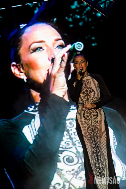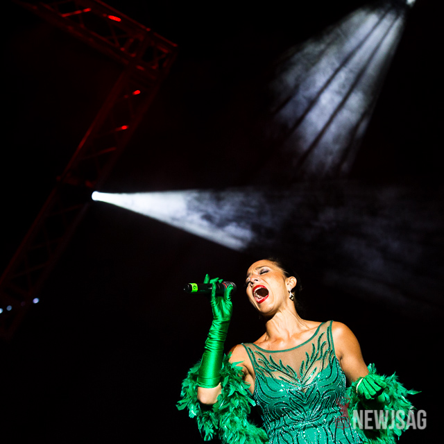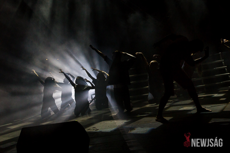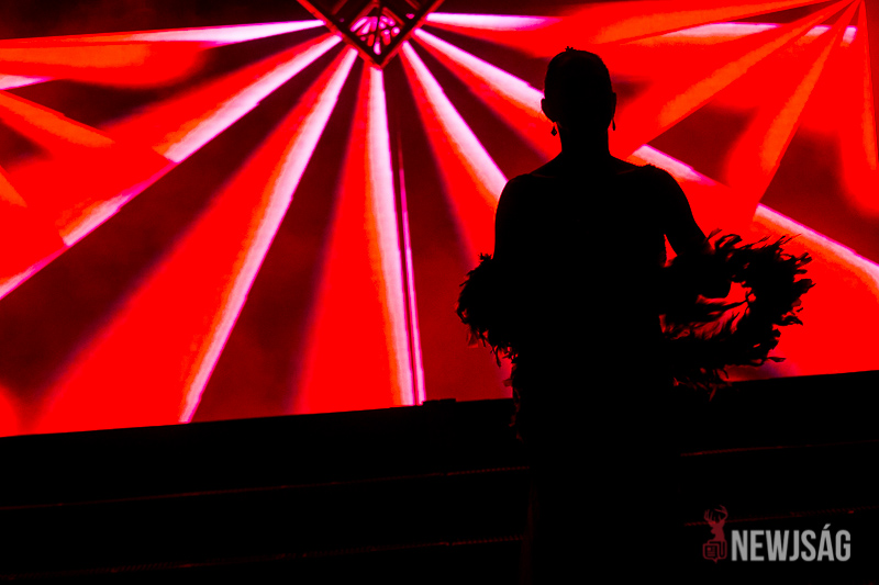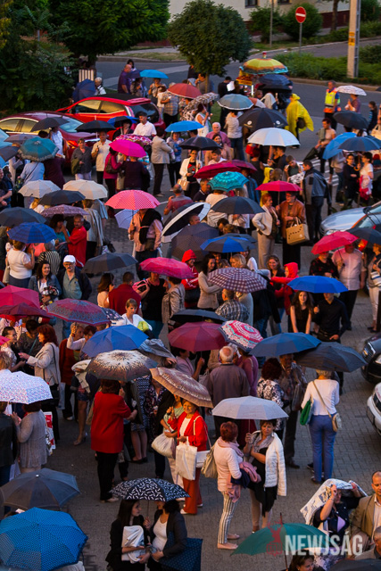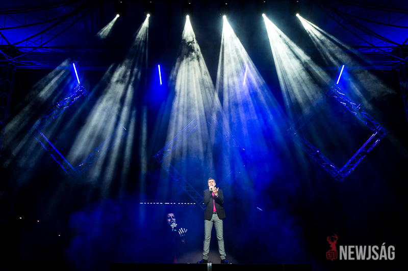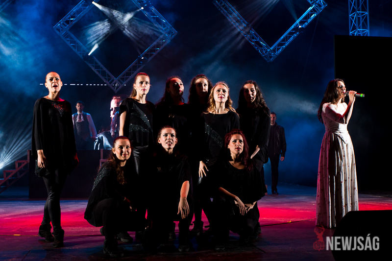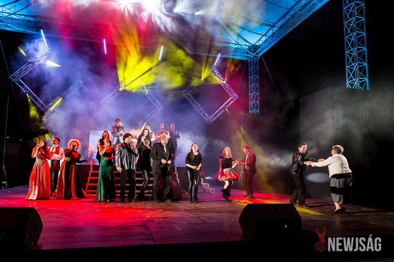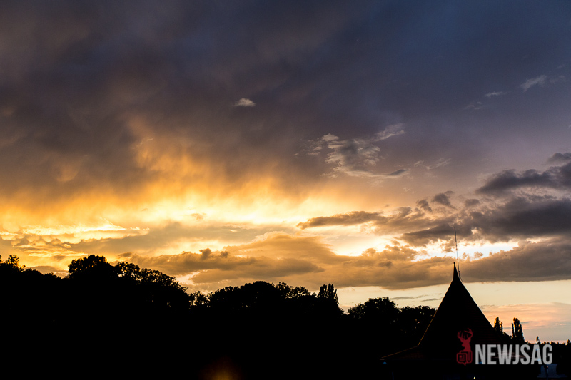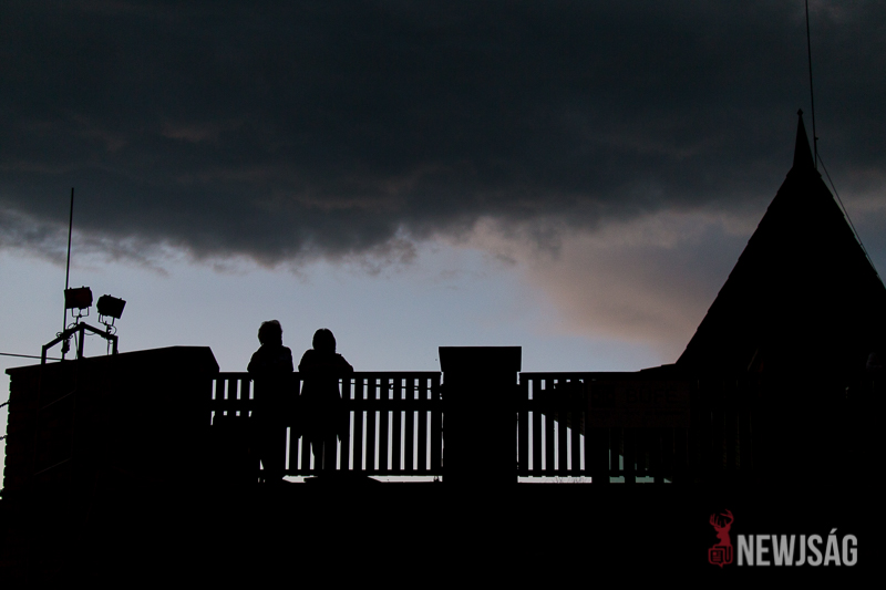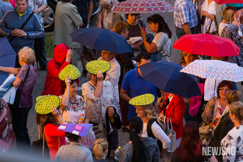 Már nagy tömeg várt a parkolóban a bebocsátásra, amikor egy nagyon rövid zápor kinyittatta az esernyőket, miközben a természet a másik oldalon csodálatos naplementével kért bocsánatot az iménti kis kellemetlenségért. Úgy néz ki, az égiek –immár hetedik alkalommal– tényleg a kegyükbe, de lassan nyugodtan mondhatjuk azt is, hogy örökbe fogadták a bő két hónapos színházi szezonunkat, az eső elállt, nem hagyott számottevő nyomot sem a színpadon, sem a székeken, de a nézők a színpadi produkció mellett az egyik szemüket így is az égi színdarabon tartották.