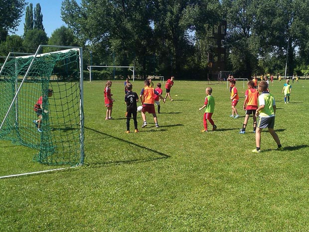 2017. június 26 és 30. között iskolánk – a rendkívül változatos programok mellett – otthont adott idén is focitáborunknak. Hétfőn reggel több mint harminc alsós kisdiák érkezett hozzánk izgalommal, hogy ezen a héten minden mennyiségben rúghassák a bőrt. Korcsoportokra bontva alakítottuk a csapatokat, így az első korcsoportos tanulókkal (1-2. osztály) Valastyán Balázs, míg a második korcsoportos tanulókkal (3-4. osztály) Farkas-Gergely Arnold tanár úr foglalkozott. A létszámra való tekintettel a programok az Erzsébet ligeti sporttelepen kerültek megrendezésre. A napi programok változatosak voltak: a kapura lövések, illetve a két kapus, egymás közötti játék mellett bójás gyakorlatok, sorversenyek, labdás feladatok szerepeltek a repertoárban. A gyerekek ezeket a feladatokat hatalmas lelkesedéssel hajtották végre, s legalább ilyen hévvel vetették bele magukat az egymás közötti játékokba is. Délutánonként különböző „vizes” programokkal színesítettük táborunkat. Hétfőn sárkányhajózhattak a gyerekek, valamint fürdőzésekkel hűthették le magukat az ifjúsági táborban, illetve a szarvasi szabad strandon, szerdán délután pedig közös fagyizás volt terítéken.