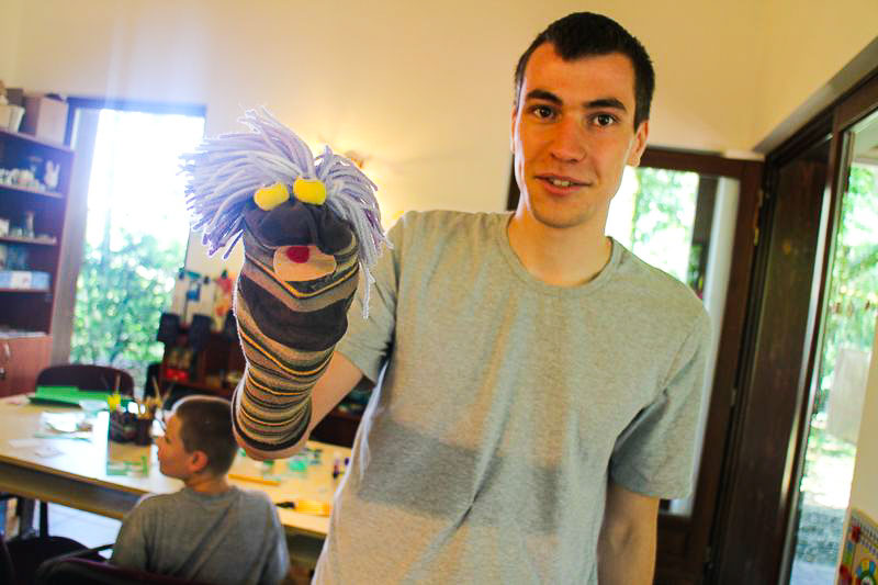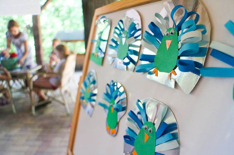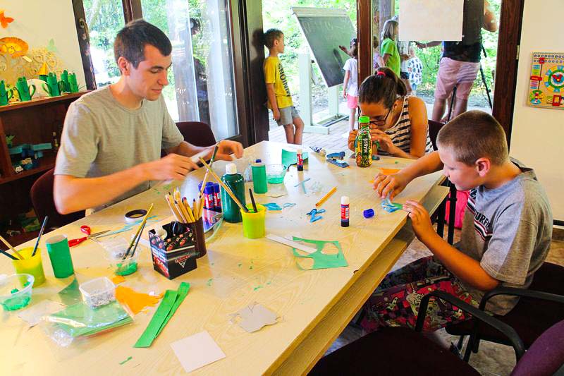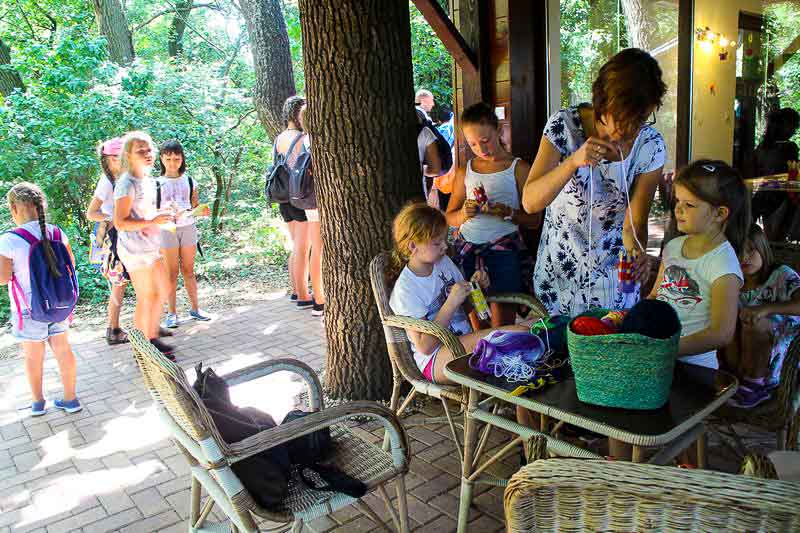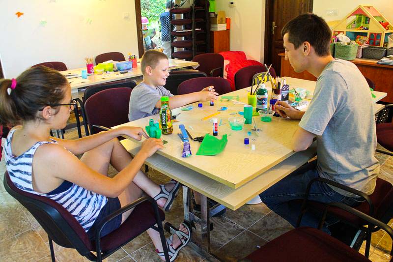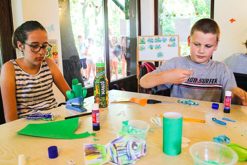 – Csináltam kékfestős békát, koponyát, fűztem gyöngyből sünit, készítettem gyűrűt és még sok mindent. Mindent beleraktam egy dobozba, ha pedig vége a hétnek hazaviszem, és ezzel díszítjük a házat – sorolja felhalmozott kincseit a nyolc éves Boti, aki épp egy papírpáva színes farktollainak ragasztásával bíbelődött.