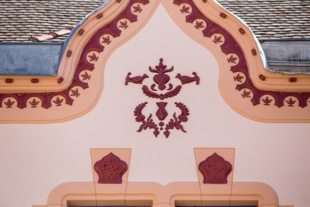 A homlokzatvakolás sem egy egyszerű vakolás volt. Ami nem kerámiából készült dísz, azt egyedileg, kézzel kellett kivakolni – ezt a munkát a cég saját kőművesei végezték.