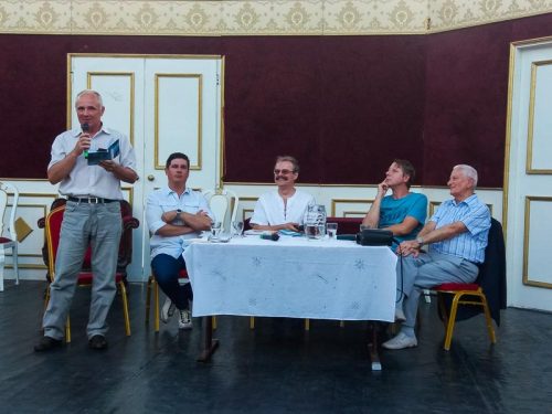 Kedden délután az irodalmat kedvelőket köszöntötte dr. Dósa Zsuzsa a Cervinus Teátrum művészeti igazgatója és Varga Viktor főrendező, az este házigazdái. Rövid bevezetőjük után dr. Elek Tibor el is kezdte az estét, amely szűkre szabott másfél óra volt. Ezalatt az idő alatt négy Békés megyében élő költő, író mutatta be legfrissebb alkotásait. Az írók, költők ismertek, így különösebb bemutatásra nem volt szükség, hiszen mindannyian álltak (ültek), már a Vízi Színház színpadán.