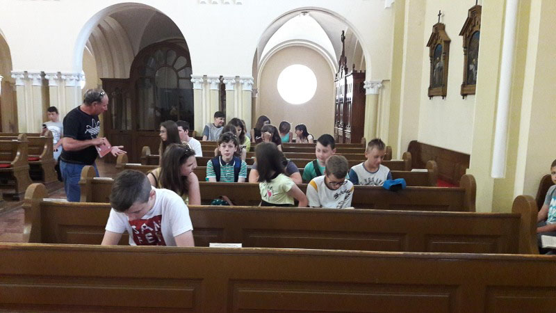 A tábor programját úgy állítottuk össze, hogy délelőttönként egy-egy nevezetességet néztünk meg, délután pedig a Balaton volt az időtöltés helyszíne. Hétfőn délelőtt a siófoki evangélikus templomban rendhagyó istentiszteleten vettünk részt, majd sétáltunk a város főterén, illetve betértünk a város központjában álló katolikus templomba. A dél körüli forróságot jégkásával, fagyival enyhítettük. A finom ebéd, majd a csendes pihenő után a tábor levonult a partra. A 22-23 fokos vízbe a bátrabbak már bemerészkedtek, többen viszont a parton, vagy a partközeli vízben találtak maguknak elfoglaltságot: homokvárat építettek, illetve sellőkké varázsolták át egymást. A vacsorát egy nagy sétával a híres Petőfi sétányon jártuk le.