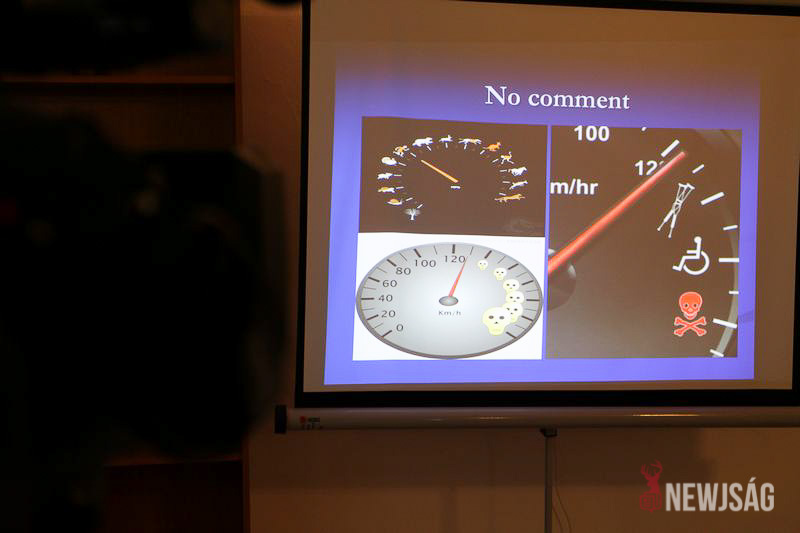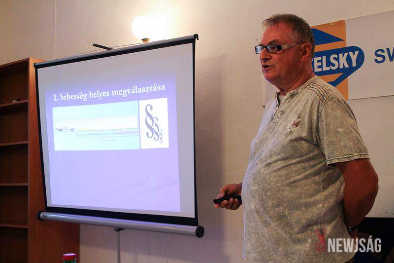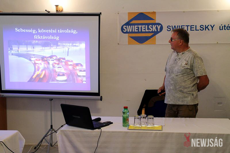 Az előadása során kitért a legfontosabb definíciókra és járművezetési helyzetekre, valamint egy animáció segítségével illusztrálta is a különböző útviszonyok baleseti következményeit.