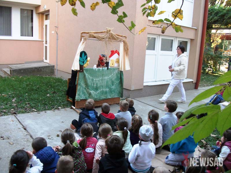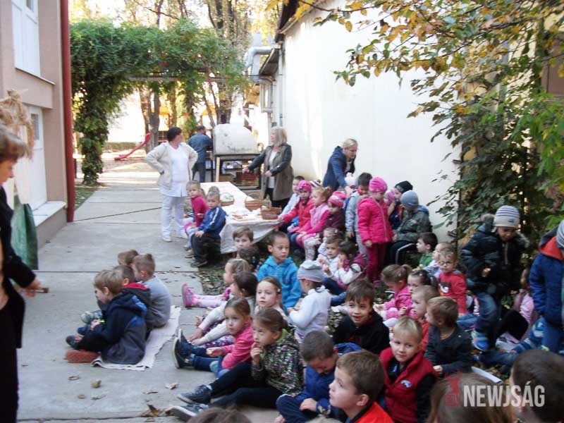 Ezen a meleg, őszi októberi délutánon nem csak az időjárás volt kellemes, hanem az udvarról beszivárgó frissen sült kalács illata is. A gyerekek már izgatottan ébredtek. Az udvaron már vártak ránk a frissen sült kalácsok és a DÖK tagjai. Szeretettel adták át nekünk a finom elemózsiát. A kalács elfogyasztása közben megtudhattuk hogyan is kell felfűteni a kemencét. De nem csak kalácsot, hanem friss tököt is süthettünk benne. Amíg sültek a tök falatkák a gyerekek egy bábelőadáson keresztül megismerkedhettek a falánk tyúkocska és a cukros kalács történetével, melyet Gyekiczkiné Piroska és Palyafári Fruzsina óvodapedagógusok adtak elő.