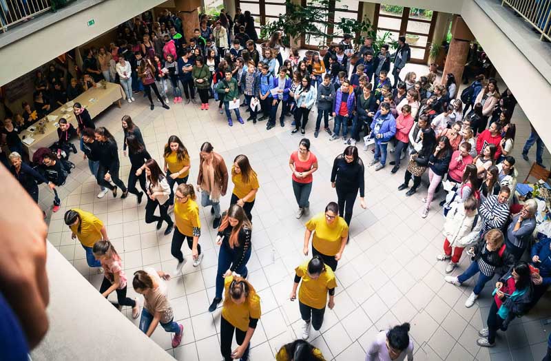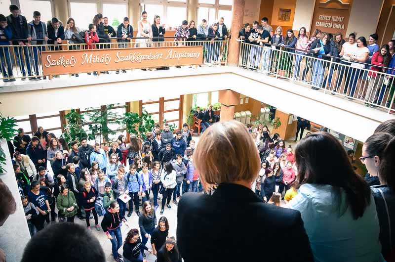 A nyílt nap teljes időtartama alatt az aula adott otthont az „ERASMUS+” pályázatokon részt vett diákok által készített kiállításnak, ahol Kohut Andrásné címzetes igazgató asszonytól, a Székely Mihály Szakképzésért Alapítvány Kuratóriumának elnökétől érdeklődhettek a megjelentek a külföldi szakmai gyakorlatokkal kapcsolatban. Részletes tájékoztatást kaphattak iskolánk kollégiumáról, az ott folyó kollégiumi közösségi életről. A délelőtt folyamán láthattak hologram bemutatót, kipróbálhatták az „Ökomatát”, a kaleidoszkópot. Az udvaron a Streat Workaut bemutató megtekintése alatt a kemencében sült finom süteményt fogyaszthatták el a diákok, és megtekinthették az állandó szakmatörténeti kiállításunkat is. A bátrabbak Rohonyné Urbancsok Zsuzsanna kolléganő irányítása mellett bekapcsolódhattak a diákjaink által bemutatott Flash mob-ba.