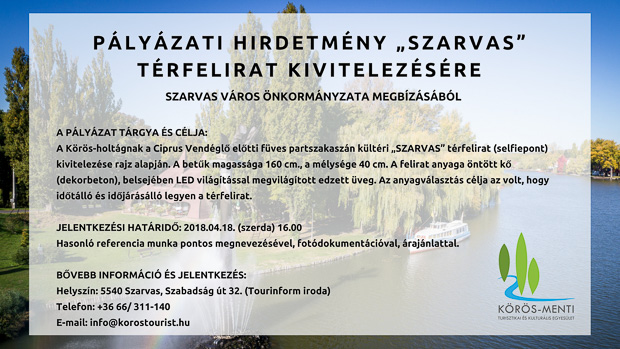A Körös-holtágnak a Ciprus Vendéglő előtti füves partszakaszán kültéri „SZARVAS” térfelirat (selfiepont) kivitelezése rajz alapján. A betűk magassága 160 cm., a mélysége 40 cm. A felirat anyaga öntött kő (dekorbeton), belsejében LED világítással megvilágított edzett üveg. Az anyagválasztás célja az volt, hogy időtálló és időjárásálló legyen a térfelirat.