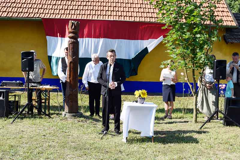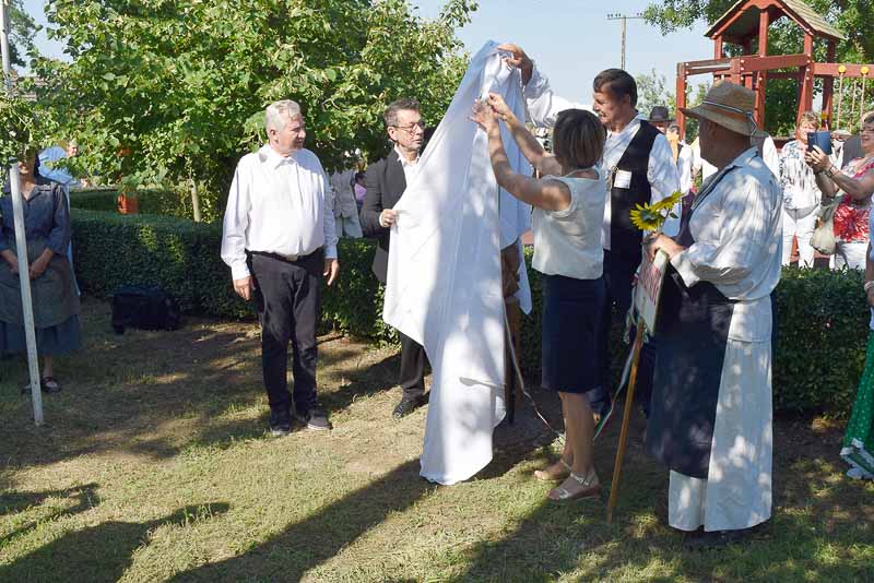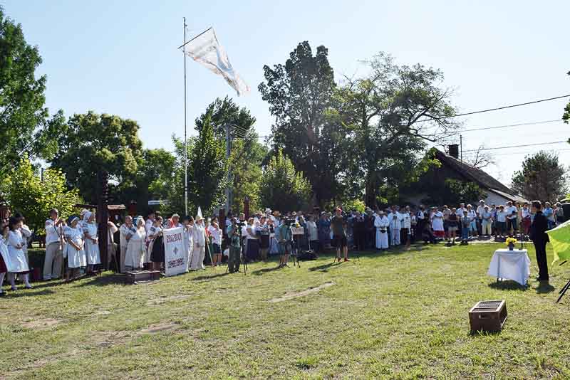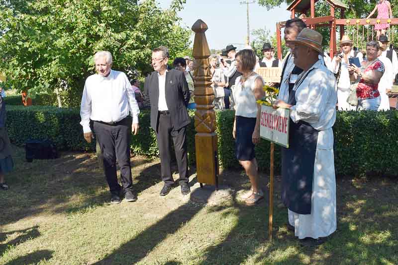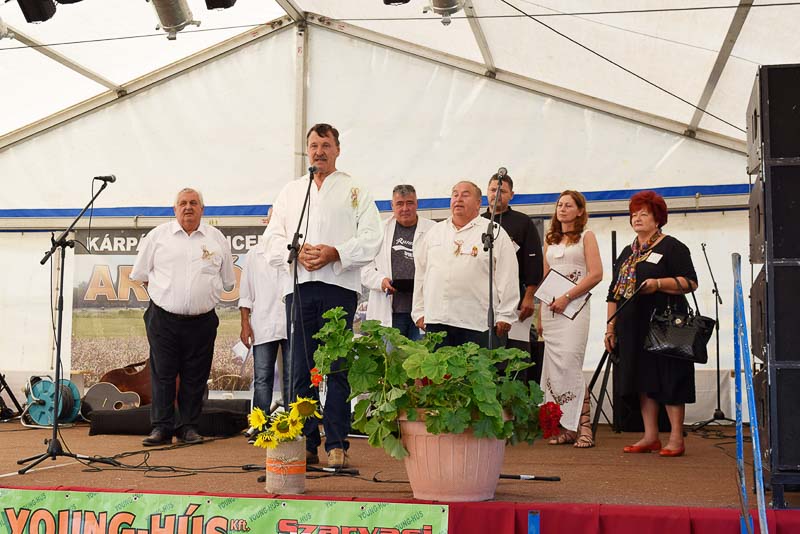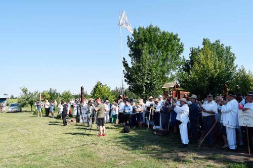Így volt ez július 14-én is, amikor reggel még kellemes, hűs időben indult az aratási felvonulás. Mire visszaértek az Összetartozás emlékparkjához, hogy a zászlófelvonást és a szokásos kopjafaavatást megejtsék, már magasabban járt a nap, és izzadságcseppeket csalogatott a homlokokra. Idén Székelykeve volt a díszvendég, polgármesterük, Kovács Mária mutatta be röviden településüket, majd Babák Mihály, Szarvas polgármestere köszöntötte nem csak a díszvendégeket, hanem a rendezvény valamennyi résztvevőjét. Jakab Istvánnak, a MAGOSZ elnökének, az Aratónap fővédnökének is a köszönetről szóltak az első szavai: köszönte, hogy a határon túli települések elhozzák ide, az Összetartozás Emlékparkjába szívük egy darabját. A tudás, a tapasztalat átadása mellett az összetartozás átélésének fontosságára hívta fel a figyelmet, beszéde végén pedig gazdag aratást kívánt. Az aratónapi hagyományoknak megfelelően ezután Kovács Mária, Babák Mihály, Jakab István és Závoda Ferenc – az Aratónap főszervezője – leleplezték a Székelykeve közössége állította kopjafát.