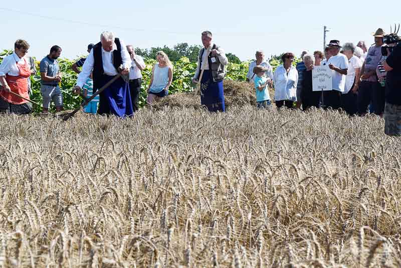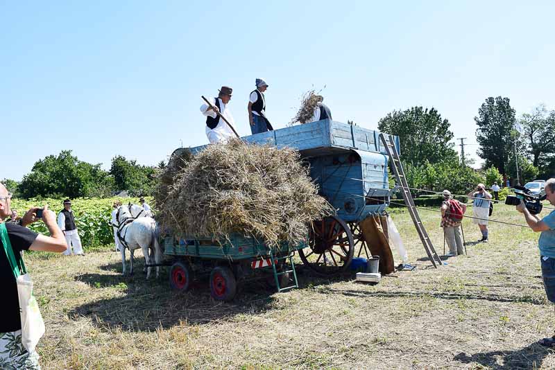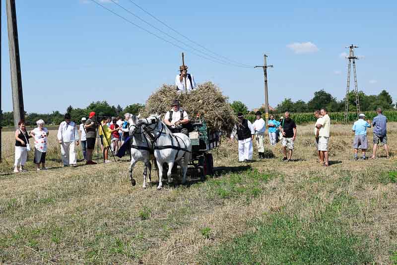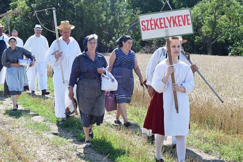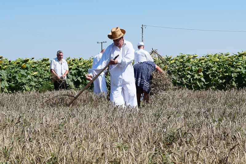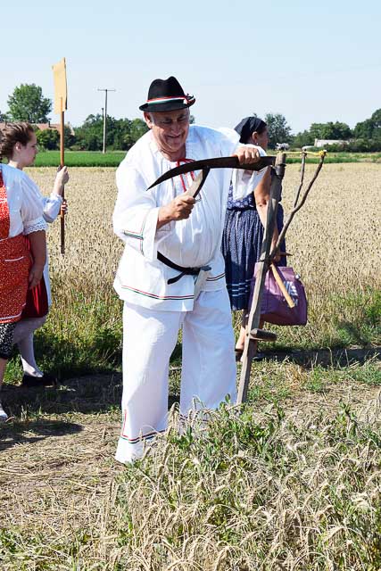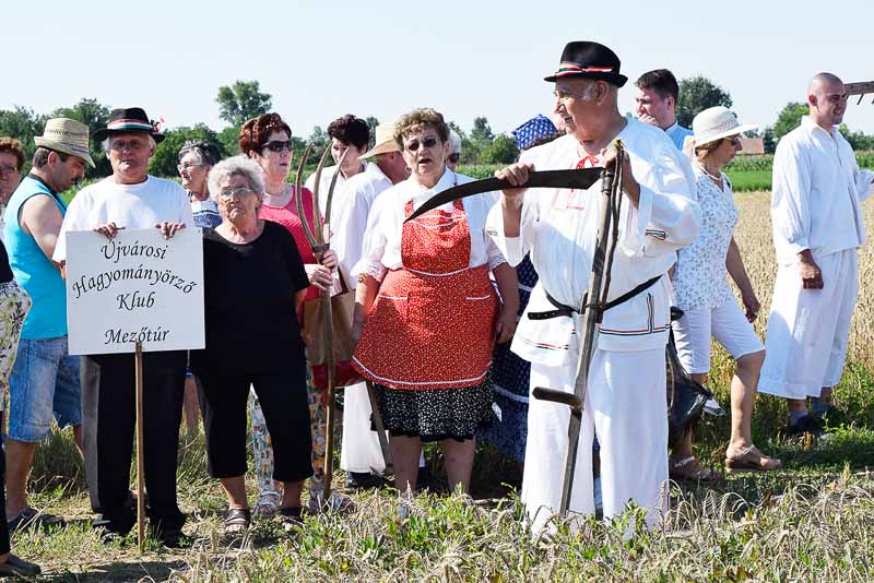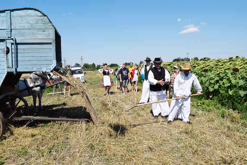 Ez idő alatt a kijelölt parcellán a kézi aratás bemutatóját nézhette meg a közönség: az első rendet Jakab István vágta, majd Székelykeve csapata és még pár település kaszásai tartottak bemutatót kaszálásból, marokszedésből, kévekötésből, keresztrakásból. A learatott búzát fürge lovacskák húzta kocsival vitték a közelben felállított múlt század eleji cséplőgéphez, ahol szemügyre vehettük, milyen lehetett hajdan ez a munka, s megállapíthattuk, hogy igencsak meg kellett izzadni a parasztembernek Magyarországon a következő esztendei kenyeréért.