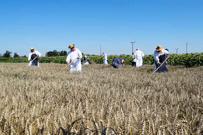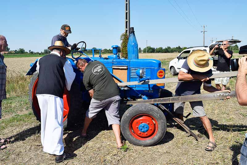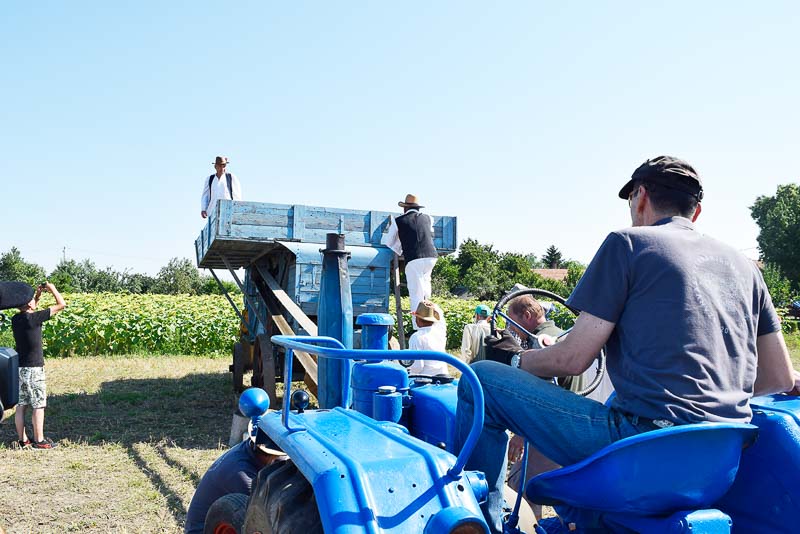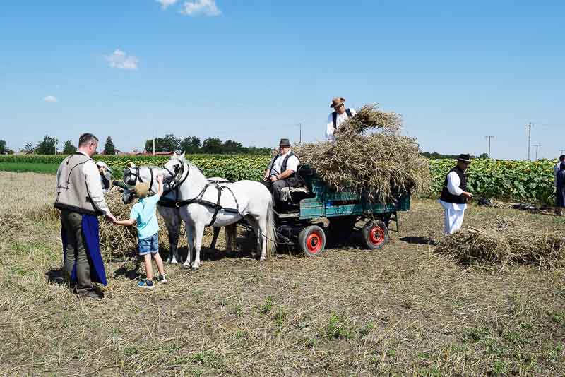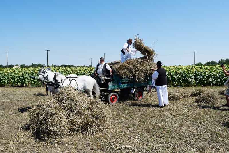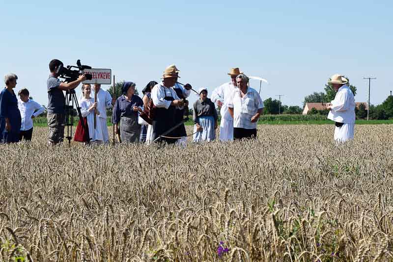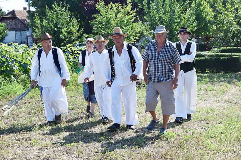 Ez idő alatt a kijelölt parcellán a kézi aratás bemutatóját nézhette meg a közönség: az első rendet Jakab István vágta, majd Székelykeve csapata és még pár település kaszásai tartottak bemutatót kaszálásból, marokszedésből, kévekötésből, keresztrakásból. A learatott búzát fürge lovacskák húzta kocsival vitték a közelben felállított múlt század eleji cséplőgéphez, ahol szemügyre vehettük, milyen lehetett hajdan ez a munka, s megállapíthattuk, hogy igencsak meg kellett izzadni a parasztembernek Magyarországon a következő esztendei kenyeréért.