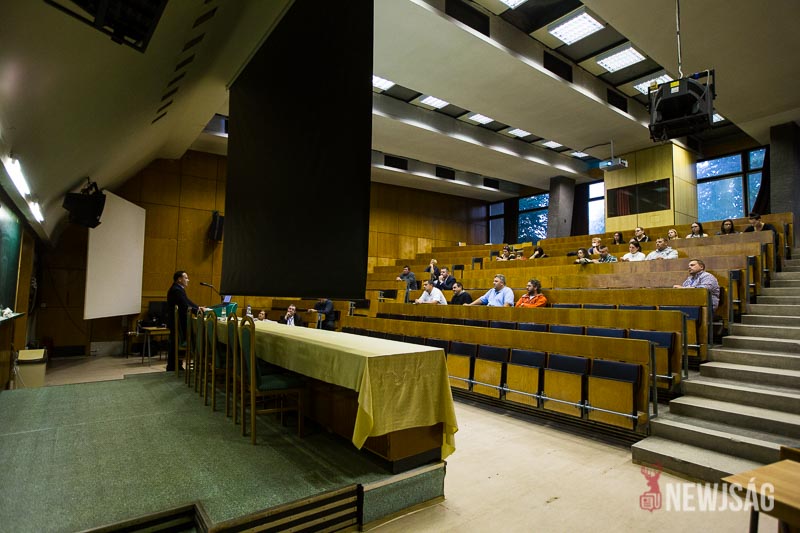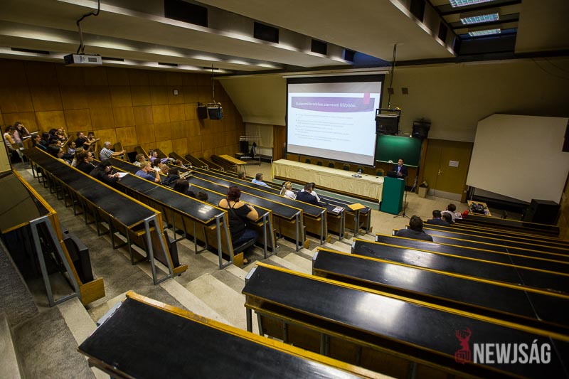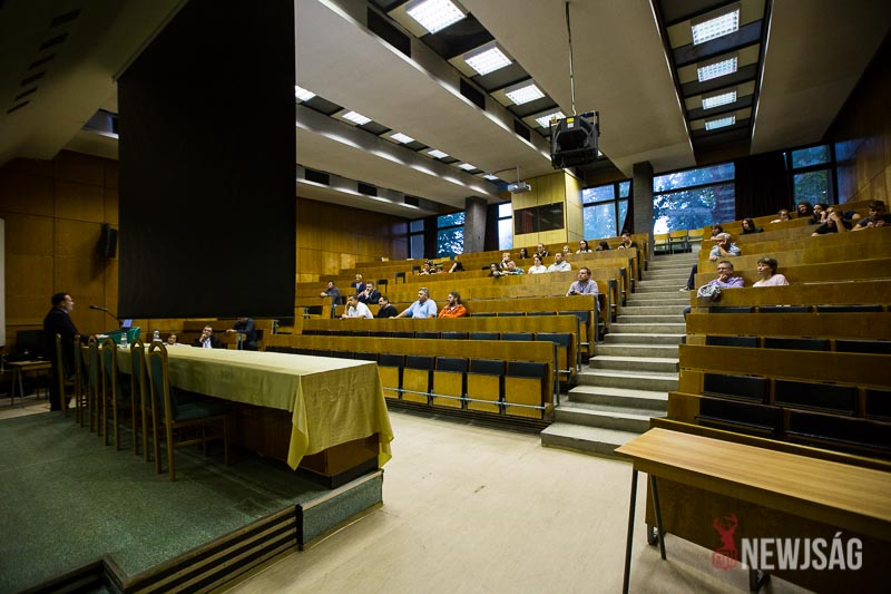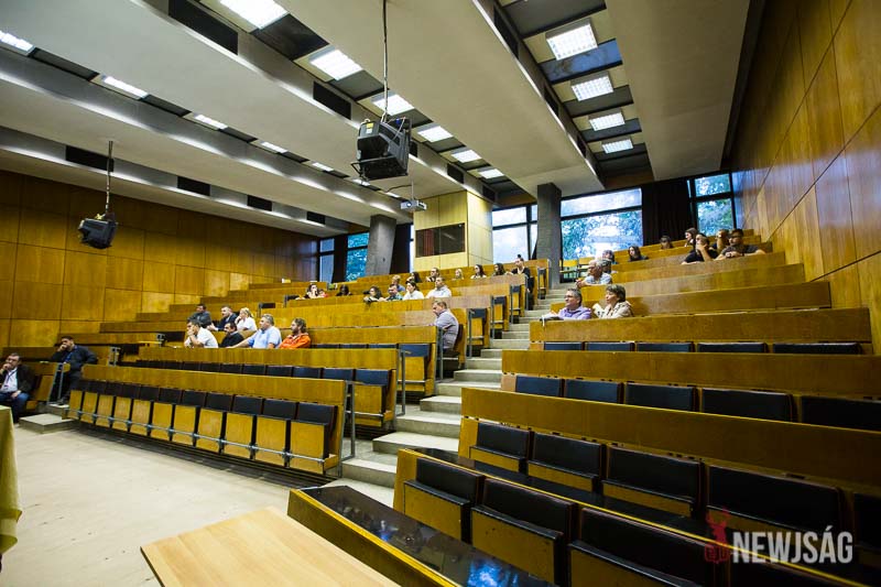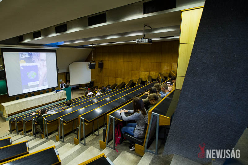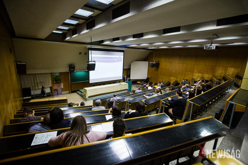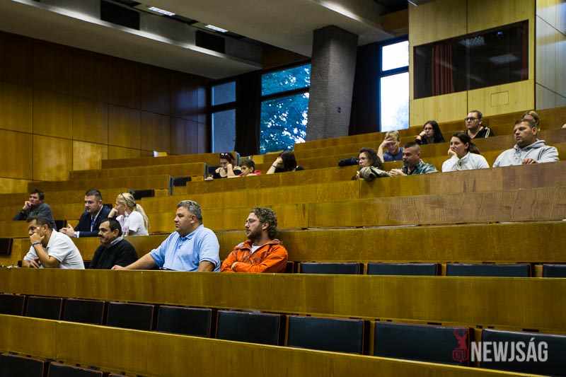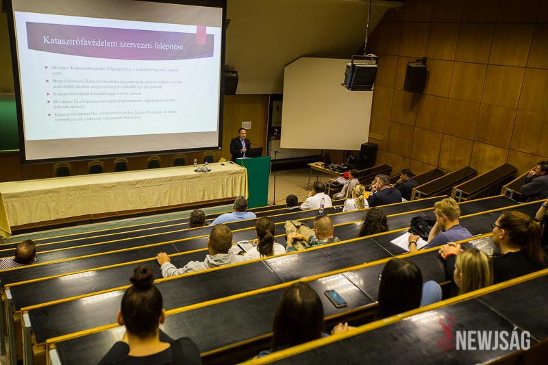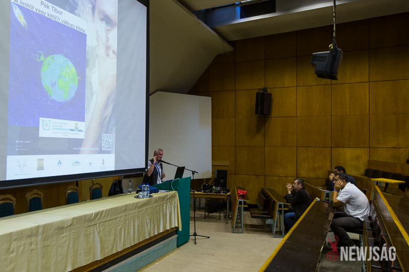 A Szent István Egyetem nagyelőadójában ottjártunkkor Pék Tibor a változó klímáról, majd Takács Árpád kormánymegbízott a Békés megyei veszélyes üzemekről tartott előadást.