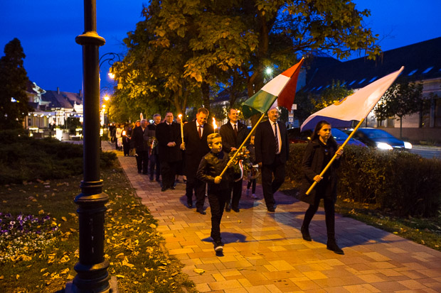 Az ünnepség második felében Bardon Ivett, László Bernadett és Ragány Misa, a Cervinus Teátrum művészei versekkel és dalokkal pendítették meg az események érzelmi húrjait. A résztvevők ezt követően fáklyákkal vonultak a Templomkert ’56-os emlékoszlopához, ahol az önkormányzat, az intézmények és a civil szervezetek képviselői elhelyezték az emlékezés koszorúit.