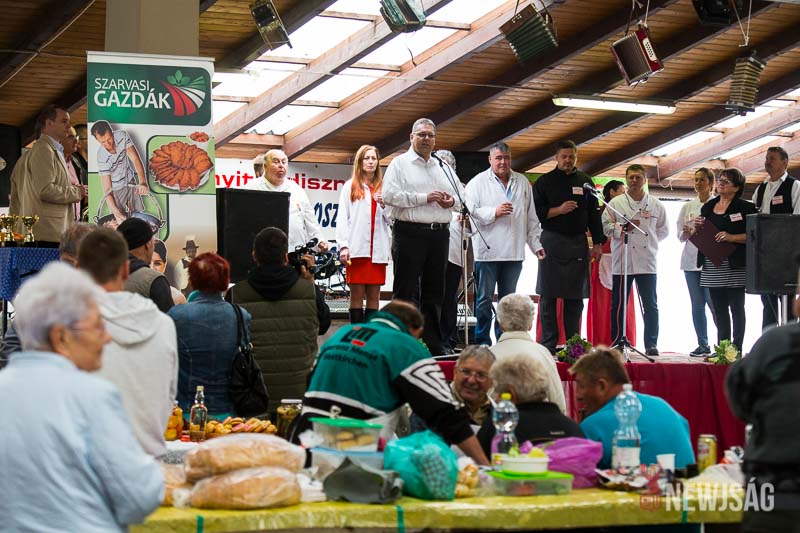 Závoda Ferenc, a Szarvasi Hagyományőrző Nemzetiségi Egyesület elnöke mottójukkal –miszerint küldetésük a hagyományokat ápolni, a hagyományokat megélni, és a hagyományokat átadni– köszöntötte a XII. Szarvasi Töltött káposzta-főző és Kolbászkészítő Verseny résztvevőit A Piaccsarnokban szombaton.