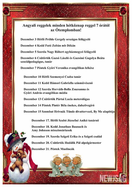 Az Angyali reggelek első hetének zárása után Lázár Zsolt esperest kérdeztük, hogy értékelte az elmúlt időszakot. Elsőként hangsúlyozta, hogy nagyon érdekes személyiségek jöttek el az első öt alkalomra: Prőhle Gergely országos felügyelő, Futó Zoltán megbízott dékán, Nagy Róbert egyházmegyei felügyelő, Gazsó László és Gazsóné Gugolya Beáta szociálpedagógus, tanár, valamint Győri Veronika evangélikus lelkész.