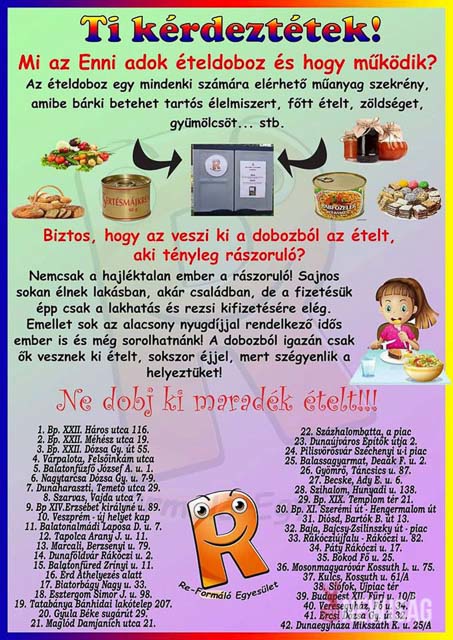 Több mint egy éve, 2017. október 22-én került ki a Vajda Péter utca 7. szám alá az Enni adok – Enni kapok elnevezésű doboz. A falra felszerelt, nyitható edényzet azon egyszerű, kissé idealista elképzelésen alapszik, hogy mindig lesznek segíteni akarók, illetve olyan rászorulók, akik betartják a doboz egyetlen írott-íratlan szabályát: háromnál több ételt egyszerre nem szabad kivenni. Talán éppen emiatt sokan kétkedve tekintettek a Re-formáló Egyesület kezdeményezésére, amelyhez országos szinten elsők között csatlakozott Szarvas.