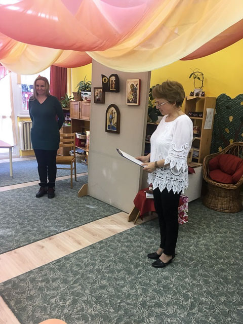 Ovi-Galériánkba csak néhány, a gyermekek számára is jól ismert bibliai személyről hozott ikont: Jézusról, és a Szent Családról, valamint két szentről: Sárkányölő Szent Györgyről, és Szent János evangélistáról. A megnyitót hálaadó imádsággal kezdtük, és a gyerekeknek számos betlehemes és hittanos ének jutott eszébe a képekről való beszélgetés közben: Jézusról, Szűz Máriáról, Gábor angyalról… Kinek, melyik tetszik legjobban? Miért? Mi jut eszedbe, amikor nézed? Láttál-e már hasonló képet? Hol? Néhányuknak eszükbe jutott a nagymami szentképe, a templom, a könyvtár szép albuma. Próbálgatták megfogalmazni gondolataikat, és izgalommal várták a délutáni mesés legendát Szent Györgyről és a sárkányról.
