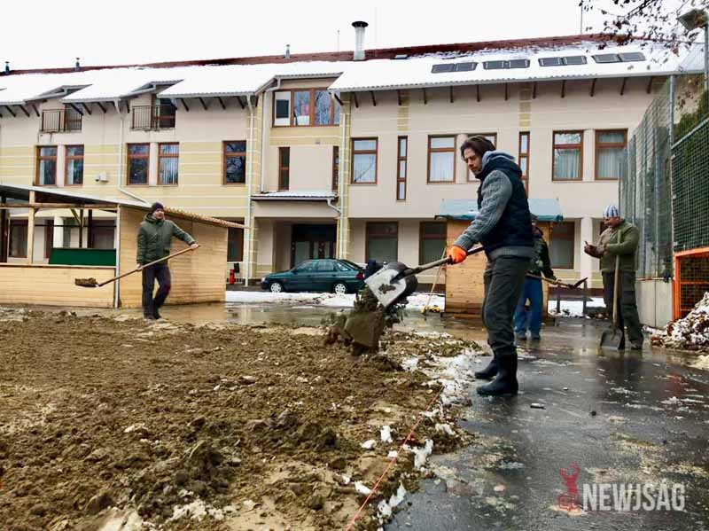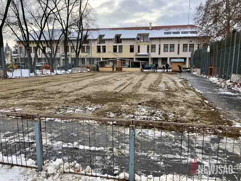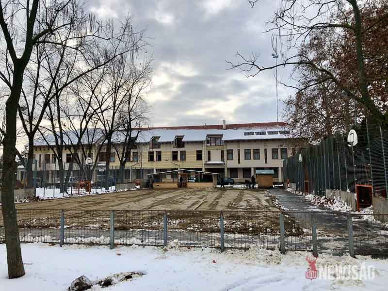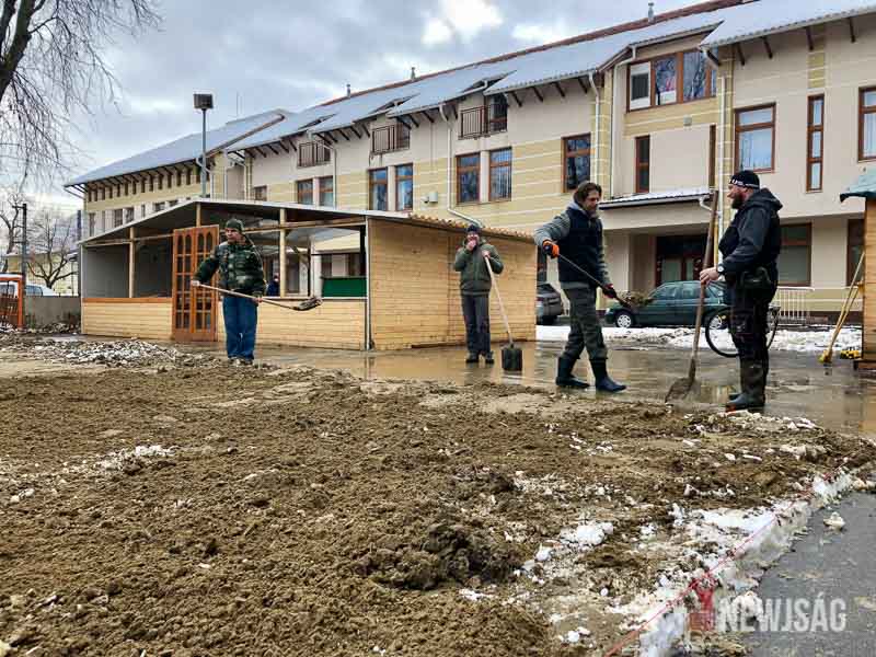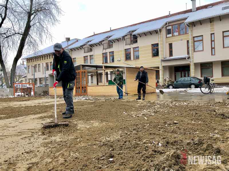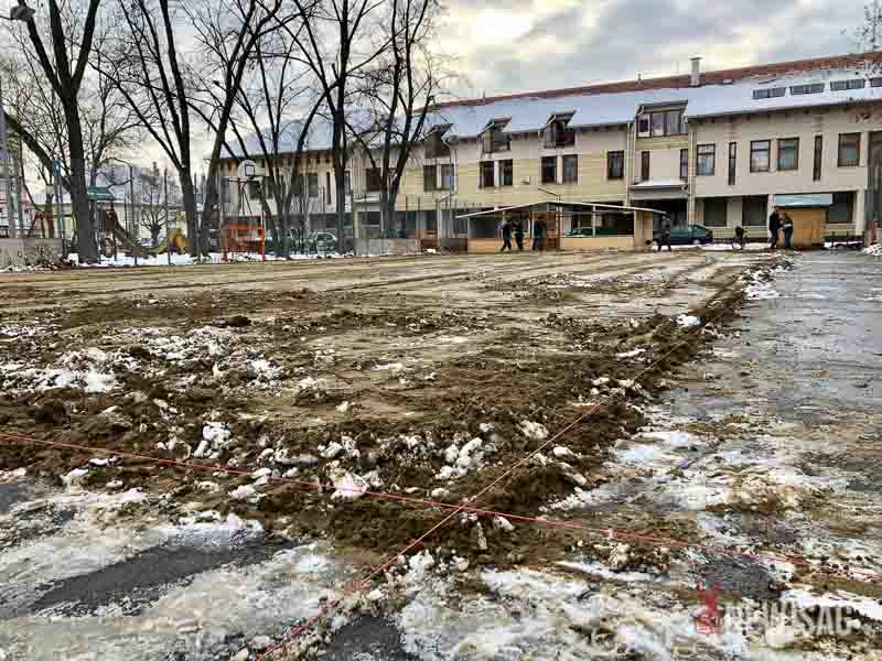 Ottjártunkkor a jégkorong-egyesület felnőtt tagjai önkéntes munkában végezték a homok terítését, mert kedden várhatóan érkezik a jégpálya, terítik le a szőnyeget, állítják csövezést és a palánkot, engedik fel vízzel a területet.