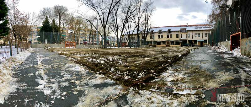 A szintezési munkák zajlanak a grundon létesítendő jégpálya területén. Ez tulajdonképpen a talaj egyenetlenségeinek homokkal történő kiegyenlítését jelenti, illetve ez a réteg nyújt védelmet az ellen, hogy az alatta levő aszfalt felfagyjon.