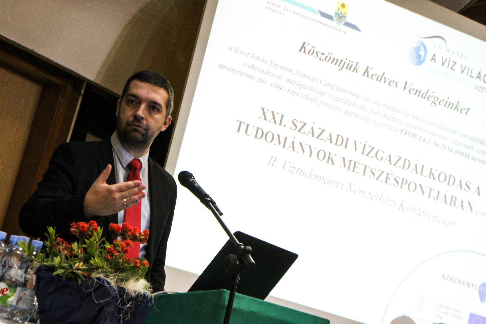 Dr. Futó Zoltán dékán emlékeztetett, a víz világnapját 26 éve ünnepeljük. Akkoriban segélykiáltásnak szánták a megalapítását azok megsegítésére, akik vízhiányos területen élnek. Ez ma kb. 200-300 millió embert érint, de sokkal több azoknak a száma, akik életében a mezőgazdaság, az állattenyésztés vagy az élelmiszer-termelés jelen van. Fontos, hogy a megváltozott világ feltételeit követve visszatartsuk a vizet, és minél jobban hasznosítsuk. Legfőbb cél, hogy 2030-ra mindenki számára elérhetővé váljon az egészséges ivóvíz. Ennek megvalósításában a mezőgazdaság kulcsfontosságú szerepet játszik.