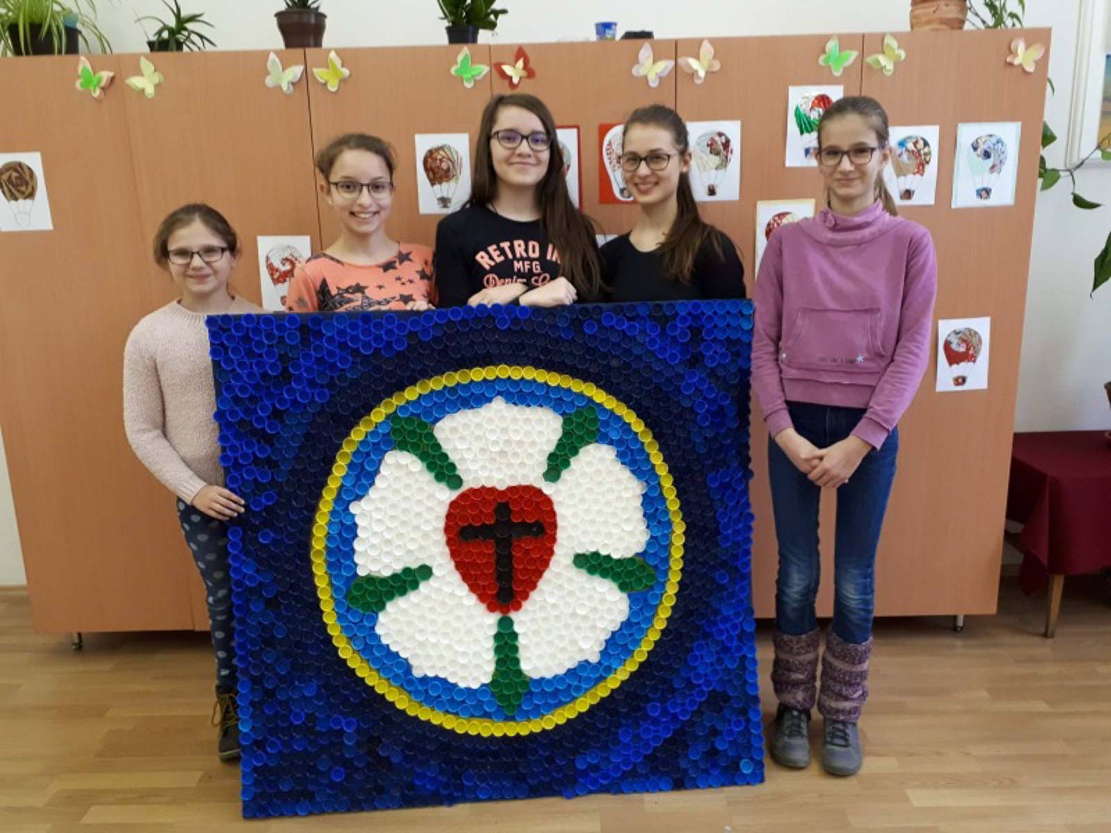 A felsős épület folyosójának legújabb dísze is felkerült a falra, mely művészi fokon kívánja felhívni a figyelmet a hulladékcsökkentés fontosságára. Az ökoszakkörös lányok több hónapos szorgalmas munkájának eredménye a műanyag kupakokból készített, Luther rózsát ábrázoló falikép.