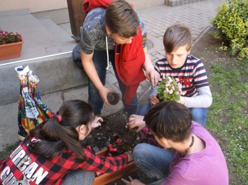 Az alsós osztályok keze nyomán szépen sorban megteltek a virágládák színesebbnél színesebb virágcsodákkal. Majd beletűzték a kompozíció közepébe osztályuk kis tábláját jelezve, hogy ettől a naptól ők dédelgetik, gondozzák, széltől-fagytól óvják ezeket a növényeket. A felsősök is virágföldtől maszatos kezekkel óvatosan ültették a kaspókba a szivárvány színeiben pompázó virágaikat. Gondos öntözés után még gyönyörködtek egy kicsit növénydíszeikben, majd megelégedéssel gondoltak arra, hogy ma is tettek valami hasznosat a Földért a Föld napján!