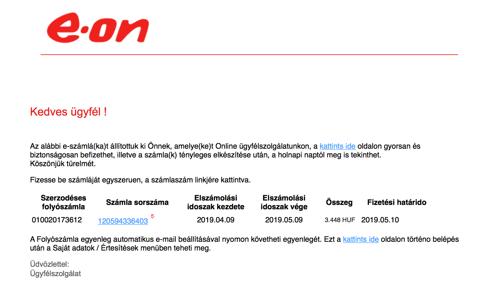 Ilyenkor normál körülmények között az első dolgom, hogy megnézem, milyen címről érkezett a levél. Ez konkrétan a szamla@eon.hu-ról, ami akár az E.On egy használt címe is lehet, sőt, válaszcímként is ezt adja fel. Ezt a küldők bekockáztatták, ha válaszol is rá valaki, vagy van szamal@eon.hu cím a cégen belül, vagy nincs. Ha van, akkor a levél esetleg ügyintéző elé kerül, aki értetlenül fogja széttárni a kezét, hogy fogalma sincs miről van szó, miután semmi azonosító, ügyfélkód nincs a levélben.
