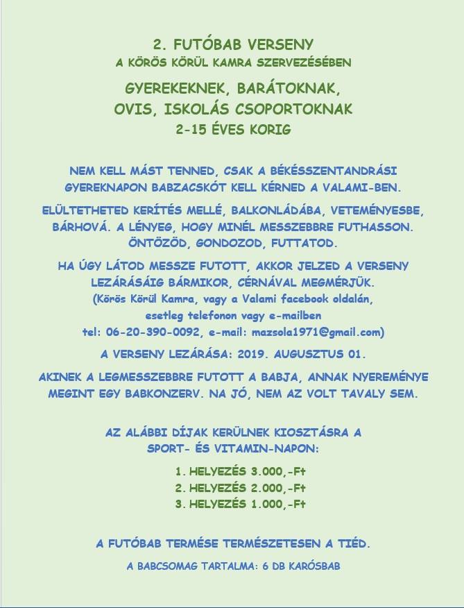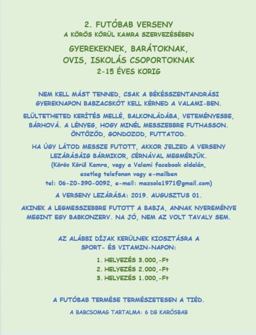 Legújabb ötletük, a futóbabverseny, aminek a plakátja, illetve kiírása galériánkban is látható. A lényege az, hogy a szentandrási gyereknapon, ami az idén az iskolaudvaron lesz megtartva, alapanyagot kell kérni a Valamiben. A csomag tartalmaz hat darab karósbabot, amit egy futásra alkalmas helyen el kell ültetni, hogy majd a verseny lefújásának a napján, augusztus 1-én cérnával lemérjék a célba érőket.