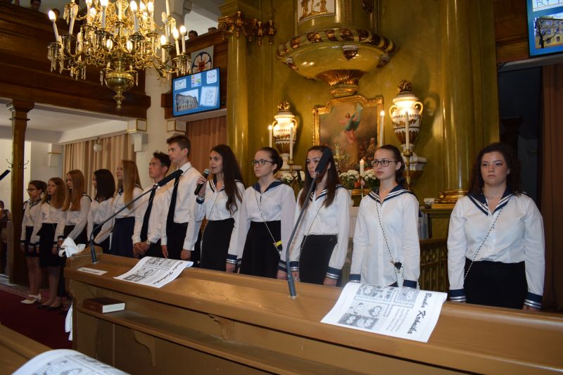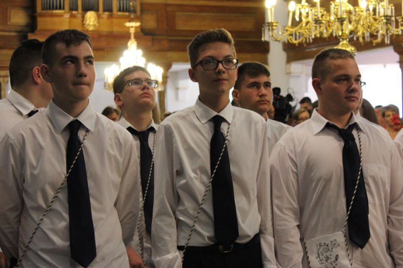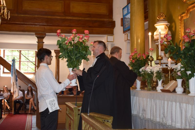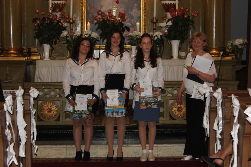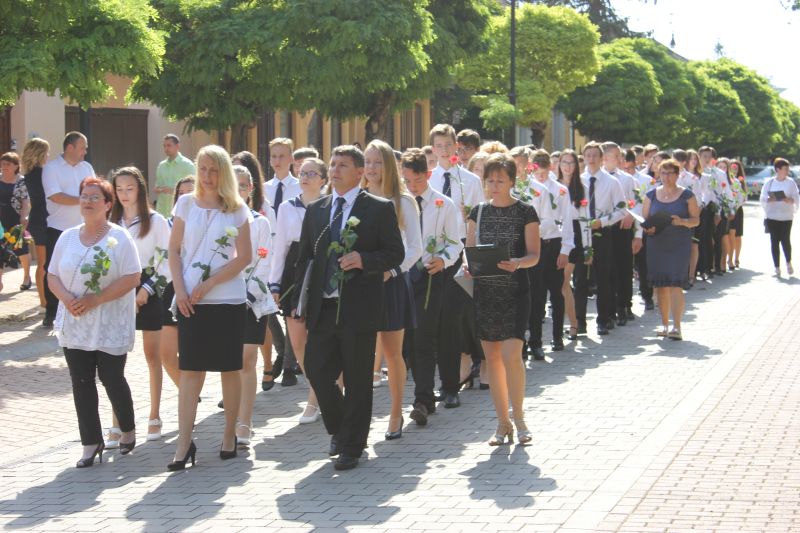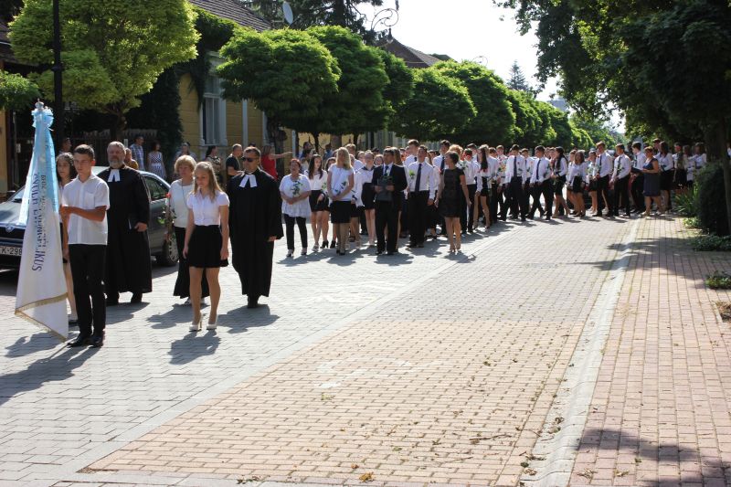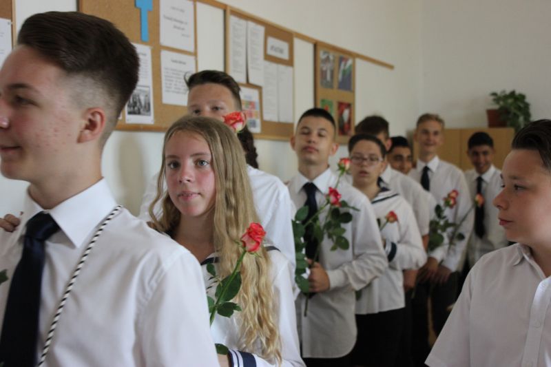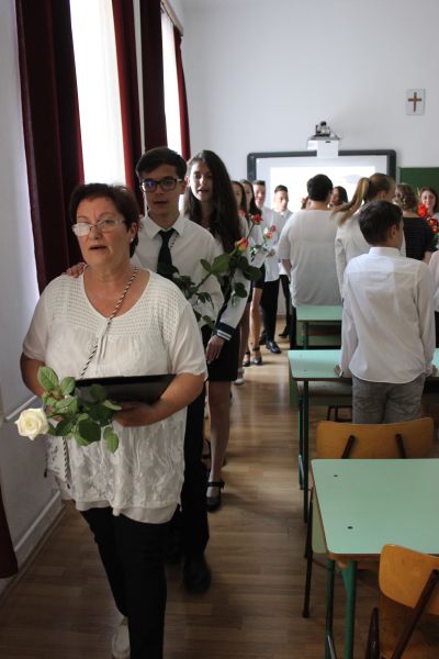 „Éljetek úgy, mint a világosság gyermekei, a világosság gyümölcse ugyanis csupa jóság, igazság és egyenesség.” (Ef 5,8-9) Ezzel az igei gondolattal szólította meg nyolcadikosainkat Molnár Istvánné igazgató asszony, majd így folytatta: „Mindenki útra kész! Felvettétek vállatokra a ballagó tarisznyát, ami jelképe annak, hogy felkészültetek. Bizonyára már van köztetek, aki várja a továbbindulás pillanatát, néhányan inkább megállnátok, és lassítanátok az idő múlásán. Tarisznyátokba sok kincset érő ajándékot rejtettünk el az elmúlt nyolc esztendő alatt. Ha nem hagyjátok a csatját berozsdásodni, akkor mindig használhatjátok a hitbéli, a szellemi, a kulturális, a magyarság, hazaszeretet igaz kincseinek örökségét. Rajtatok múlik, hogy a tarisznyátokat kinyitjátok- e.”